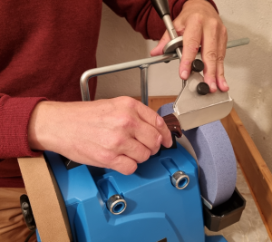 Una volta individuato l’angolo corretto, sarà necessario impostarlo sulla mola, utilizzando le guide che vengono fornite con la stessa. Si tratta in sostanza di barre e morsetti che consentono di regolare e tenere fissa la posizione con cui andremo a passare la lama sulla ruota abrasiva. Una volta impostato l’angolo in questo modo sarà sufficiente passare uniformemente la lama sulla mola sino alla punta, da entrambi i lati, e con dolcezza e senza sobbalzi, per avere un trattamento uniforme.