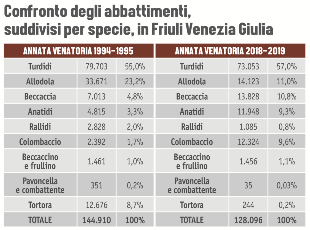 Nel 2018-2019 sono stati abbattuti nelle 238 riserve sociali 128.096 migratori contro i 144.910 del 1994-1995: una diminuzione del 12%. Il calcolo è stato fatto senza considerare la quaglia, oggetto di immissioni pronta caccia effettuate (legalmente?) con la Coturnix japonica, quaglia giapponese, e i corvidi. Molto utile è invece il confronto fra alcune specie.