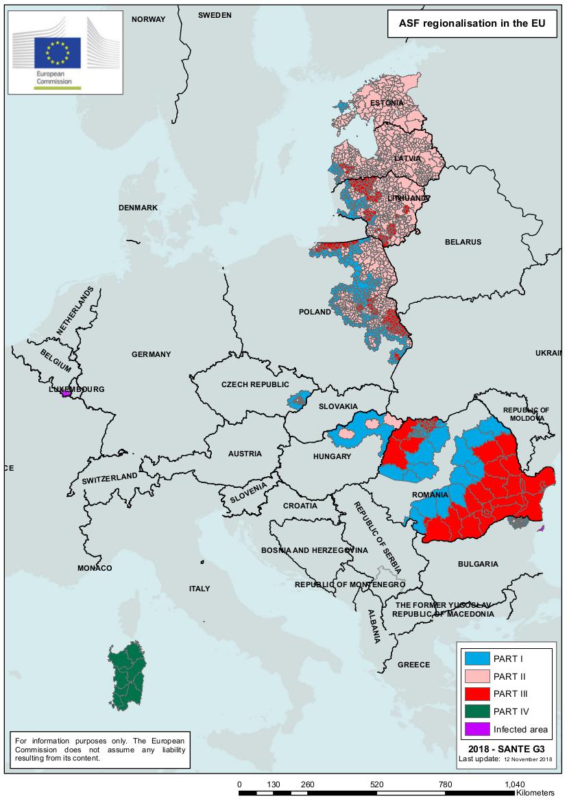 La diffusione della peste suina africana nell’Unione europea (fonte: Commissione europea – chiaramente nell’immagine non