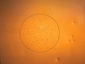 Lo sparo della cartuccia si è svolto nel campo di tiro a volo di Pisa, grazie alla disponibilità della famiglia Matteoni che gestisce l’attività. Abbiamo sparato con un Benelli Comfort calibro 12, corredato di canna da 70 cm di lunghezza e strozzatore 3 stelle o Modified che dir si voglia (interno/esterno, 2 cm esterni, marca Gemini). Questo per poter testare il comportamento balistico come se sparassimo una munizione in acciaio, visto che il rame segue la stessa normativa (valore massimo di 3 stelle utilizzabile negli strozzatori standard). Le distanze di tiro sono state settate a 25 e a 32 metri.