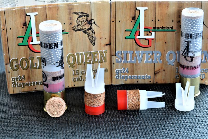Per quanto riguarda le scatole, rispetto a quelle in cui sono riposte le cartucce in 12 l’unica vera differenza è il numero di munizioni che contengono, ben 15. Complice il calibro ridotto, è stato possibile adottare questo numero “particolare”. Viene mantenuto l’effetto legno di colore chiaro sul cartone, piuttosto gradevole; sul frontespizio è riportata la scritta ALG, tratteggiata con i colori della bandiera italiana, e una beccaccia in volo verso destra nella porzione antero-superiore. Permangono anche i buchi che simulano l’effetto dei pallini. Nella parte centrale della scatola le due scritte identificative, in oro per la Golden Queen e in argento per la Silver Queen. Con lo stesso colore, le scritte riportano la grammatura della cartuccia, la parola “dispersante”, il numero di cartucce contenute nella scatola, il calibro e l’altezza della cartuccia stessa. Il tutto viene riproposto sul lato inferiore della scatola, mentre il restante spazio è dedicato alle consuete frasi di avvertenze e warning. Il tutto è piacevole, più che altro per la novità grafica.