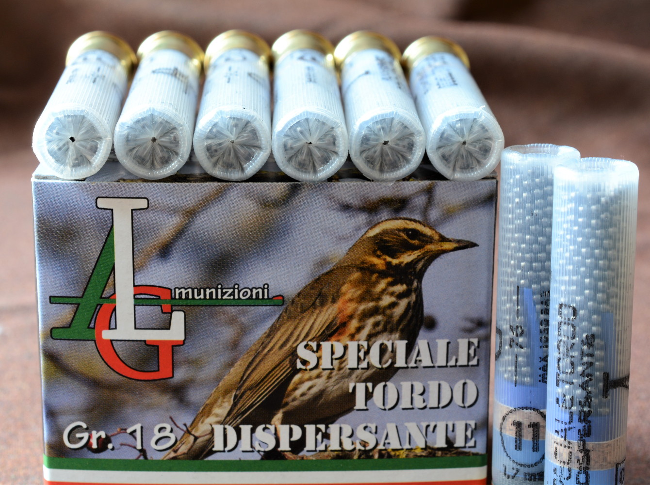 L’Alg Speciale tordo dispersante calibro .410 è venduta in una scatola da 25 cartucce (box in cartone da 250), capacità corretta per cacciare il tordo e persino esuberante per la beccaccia. La scatola è dominata dall’immagine di un tordo sassello su un ramo affiancata dalla scritta col nome del prodotto. Oltre a questo, sul frontespizio c’è poco altro: la grammatura, una fascia orizzontale tricolore e il logo di Alg, acronimo di Alessandro e Lorenzo Giacchi, titolari della ditta.