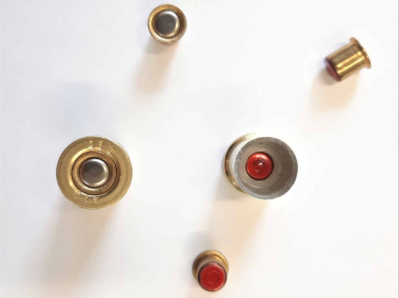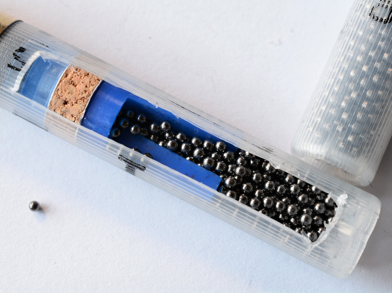 Il bossolo è un Cheddite traslucido alto 76 millimetri, con rigature che rendono la stampa non di facilissima esecuzione; comunque, la vernice nera sui bossoli riporta le scritte “Speciale tordo dispersante” e “Alg”, la numerazione e il diametro dei pallini, l’altezza del bossolo e la massima pressione raggiungibile (1.050 bar). È particolarmente indovinata la scelta di utilizzare un bossolo trasparente che lascia a vista la componentistica interna. Il fondello è ottonato tipo 3, alto 16 millimetri, equilibrato per la tipologia di munizione. Anche l’innesco è un Cheddite, il Cx50 caratterizzato dal corpo ottonato e dalla vernice protettiva copri foro di vampa di colore rosso.