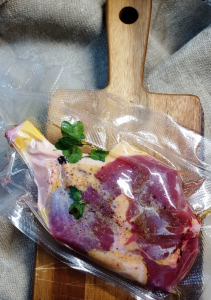 Ora cominciamo con la preparazione del piatto, la nostra anatra all’arancia in chiave moderna. Condite le cosce con alcune bucce d’arancia, scalogno, menta, ginepro, origano, pepe e un pizzico di sale. Confezionatele in sottovuoto al 99%. Cuocete per dieci ore a temperatura controllata con il roner (69°C).