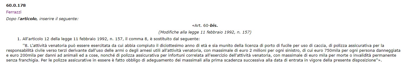 Tra le pieghe degli emendamenti alla legge di bilancio finiscono anche i massimali dell’assicurazione venatoria. Andrea Ferrazzi, senatore del Partito democratico, ha proposto di ritoccarli considerato che, formalmente, la legge in vigore fa ancora riferimento agli importi in lire.