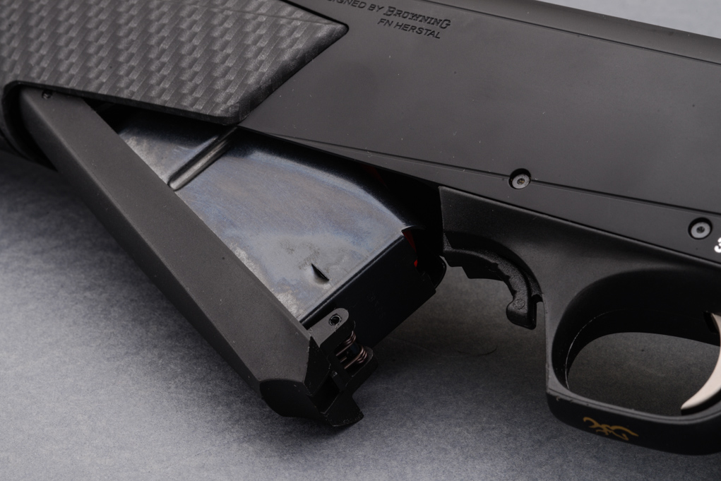 Nella parte inferiore della carcassa è ricavato l’alloggiamento del caricatore. Nel caso dell’arma in prova quest’ultimo è incernierato anteriormente alla carcassa e contiene solo 2 colpi. Decisamente preferibile l’allestimento Dbm (Detachable box magazine), removibile e più semplice da riempire.