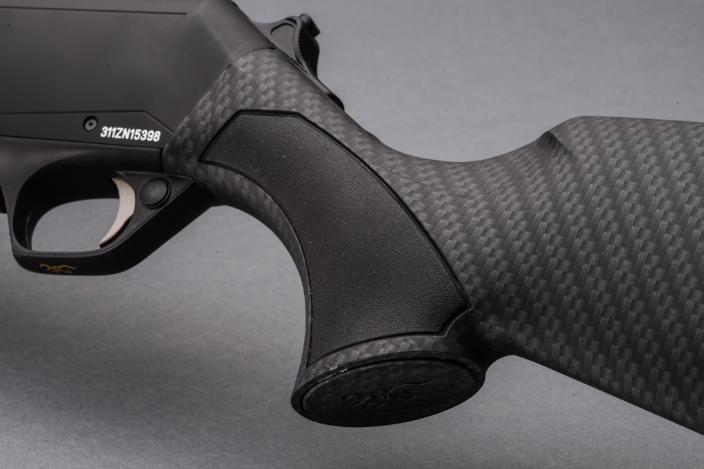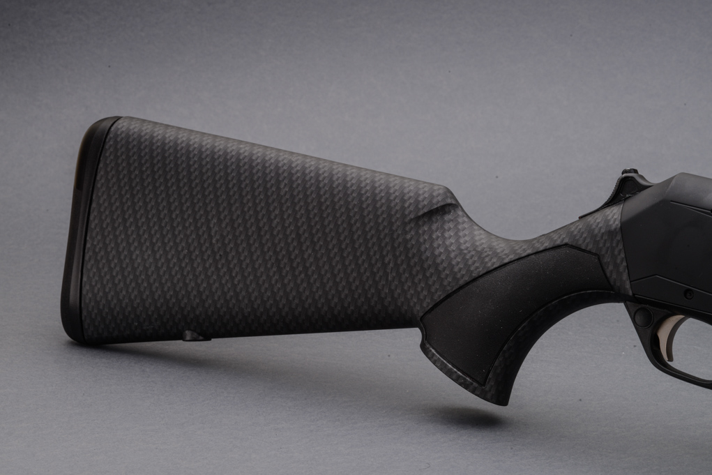 La calciatura è in polimero ricoperto di un film che ricorda in maniera molto realistica la fibra di carbonio; su pistola e astina – a tulipano – sono presenti inserti in gomma molto grippanti. È disponibile anche in allestimento mancino ma solo nei calibri .308 W e .30-06 S, non nel 9,3×62 camerato nell’arma provata. Al termine della pala spicca il calciolo Inflex II disponibile negli spessori di 12, 20 e 25 millimetri; in partenza è montato quello da 20 mm che porta a una Lop di 360 mm. La densità del calciolo è pensata per deviare le forze del rinculo verso il basso, allontanando leggermente il calcio dal viso del tiratore allo scopo di ridurre il rinculo percepito e il movimento della canna verso l’alto.