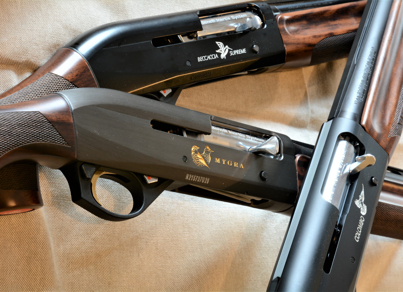 Colombo, Beccaccia Supreme e Mygra sono i fucili specialisti di Benelli dedicati rispettivamente alla caccia a colombaccio, beccaccia e piccola migratoria. Sono tre fucili semiautomatici; le forme sono quelle, snelle, tipiche dei semiautomatici Benelli, con evidente (e ovvio) vantaggio per le due versioni in calibro 20, Beccaccia Supreme e Mygra, che godono di linee filanti e dimensioni ulteriormente contenute rispetto al Colombo calibro 12.