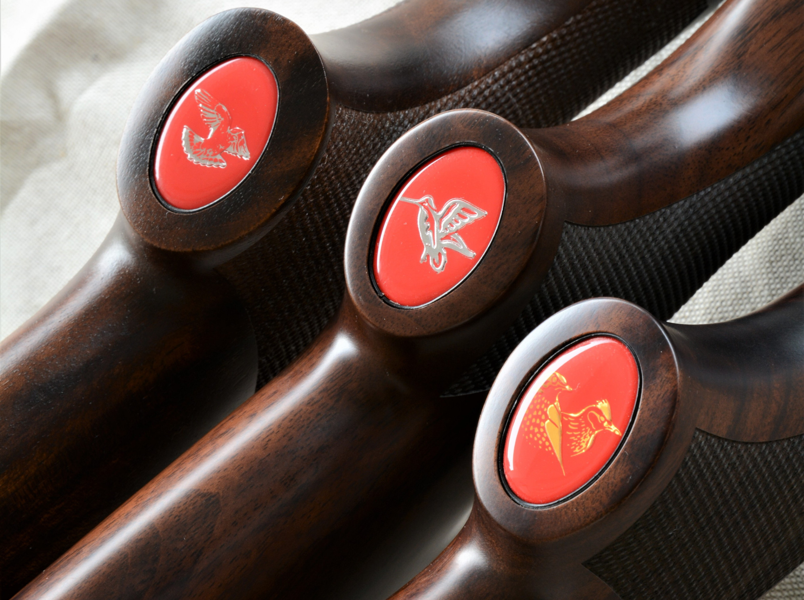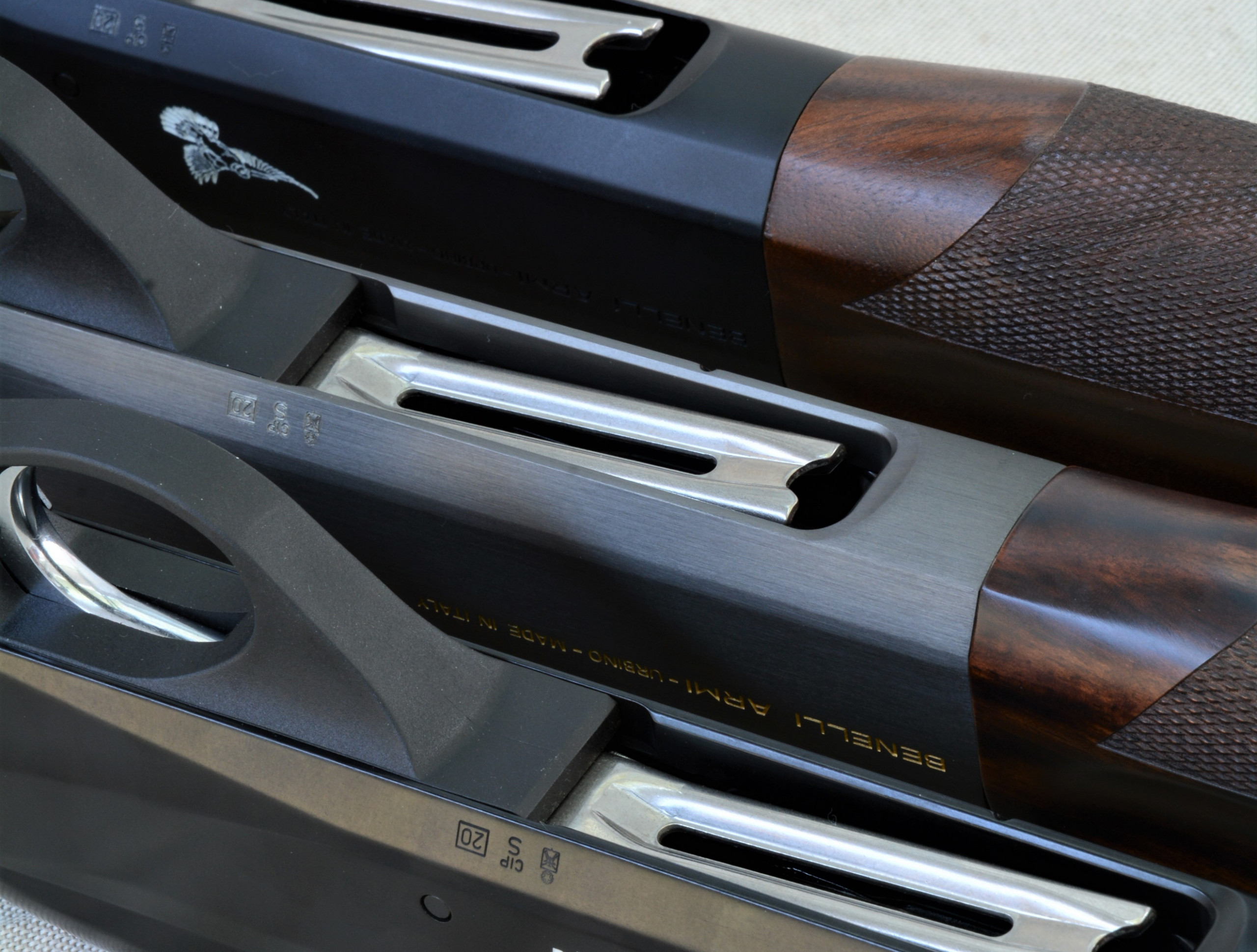 Ogni arma ha una sua precisa connotazione, che deriva anche dai riferimenti visivi sulla carcassa: il Beccaccia Supreme e il Colombo si fanno notare per la sagoma del selvatico; sulla carcassa di una gradevolissima colorazione grigia il Mygra presenta invece l’immagine dorata di un tordo bottaccio e di un’allodola. Niente di invasivo, soltanto i selvatici stilizzati che identificano immediatamente la singola arma. Anche sulla coccia si trova lo stesso cliché, per una presa di coscienza esaustiva anche con le armi in rastrelliera.
