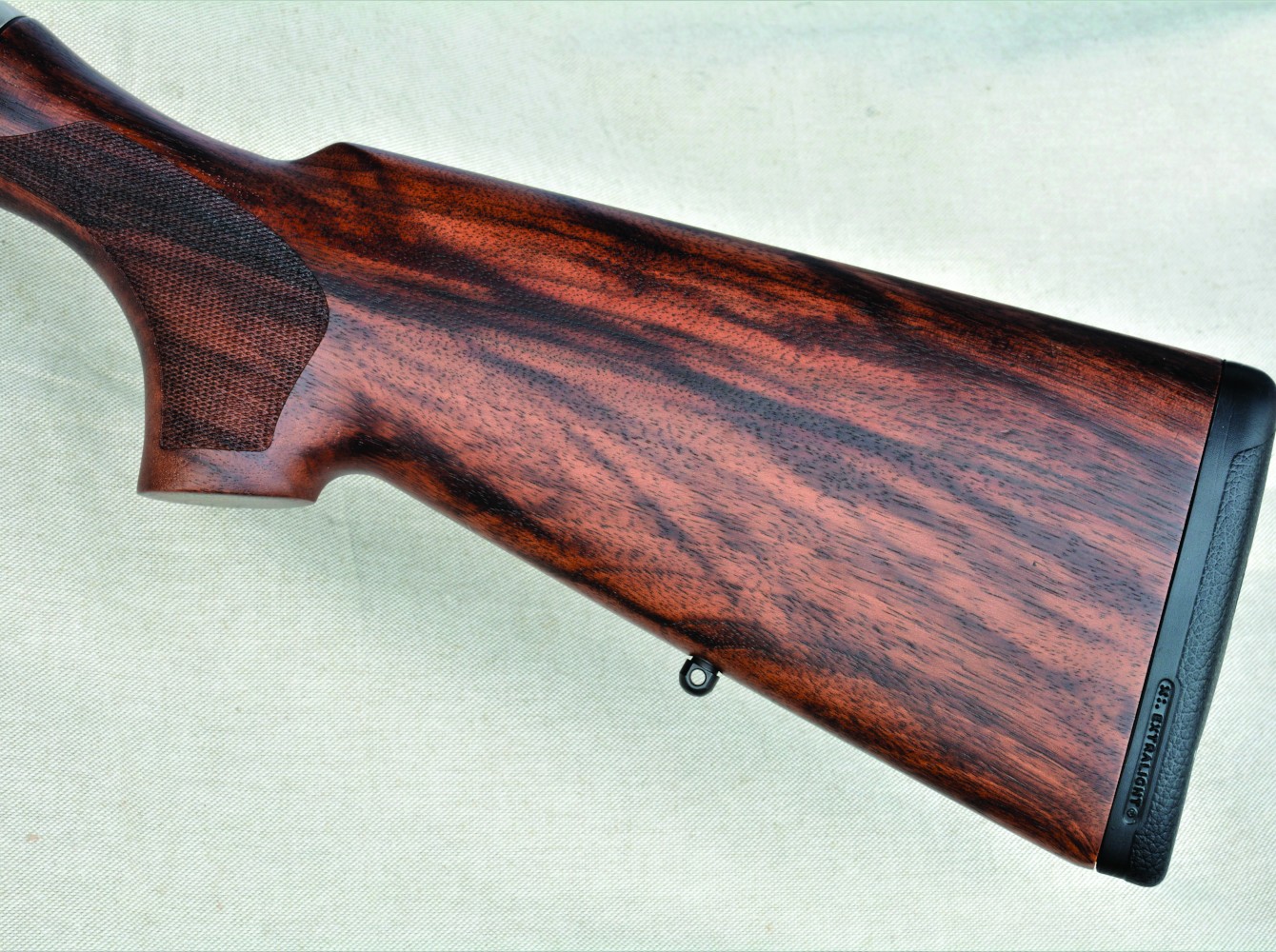 Il calcio è in legno di noce; il design ergonomico dell’astina e dell’impugnatura a pistola consente un utilizzo agevole a mani di diversa grandezza. La zigrinatura sull’impugnatura è laserata; l’andamento, piacevole, si discosta un poco dalla forma classica. Se proprio vogliamo essere pignoli, aggiungerei una piccola porzione di zigrinatura nella zona dove il pollice che chiude l’impugnatura va a toccare il legno.