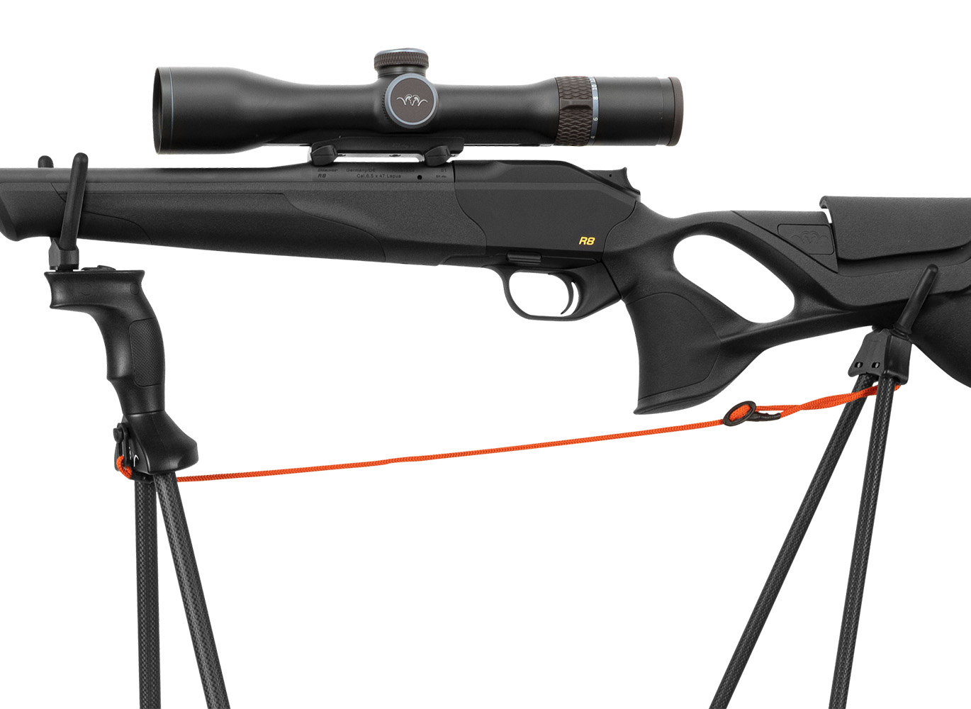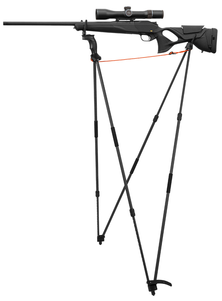 Rispetto al modello precedente, le viti – in elastomero – possono ora essere strette più saldamente e quindi garantire una posizione stabile in ogni situazione di caccia. Una serie di indici stampati sugli steli facilita la regolazione in altezza. Un perno in gomma dura nella base d’appoggio riduce al minimo il rumore durante l’uso. La cinghia staccabile e regolabile che unisce la parte anteriore a quella posteriore assicura una diffusione costante del peso del bastone nel trasporto e la regolazione della distanza ottimale tra gli appoggi.