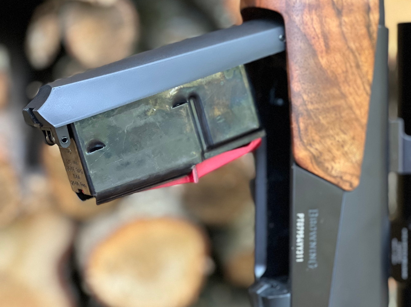 Riconfermato ovviamente il vincente impianto meccanico; la presa di gas è dotata di un grano regolabile che consente l’utilizzo dell’arma anche in combinazione con un moderatore di suono, operazione, però, che è bene lasciare eseguire a un armiere qualificato. Il calibro era sempre il .30-06 e le cartucce impiegate sempre le Winchester Extreme point con palla di 150 grani; tuttavia, a causa della legislazione francese, la carabina era dotata di caricatore con capacità di due sole cartucce e incernierato alla parte anteriore della carcassa, non completamente staccabile. Non è stato quindi possibile effettuare la sostituzione del caricatore; premendo il tasto di sgancio, collocato davanti al ponticello, il caricatore basculava, rimanendo vincolato alla carcassa nella sua estremità anteriore.