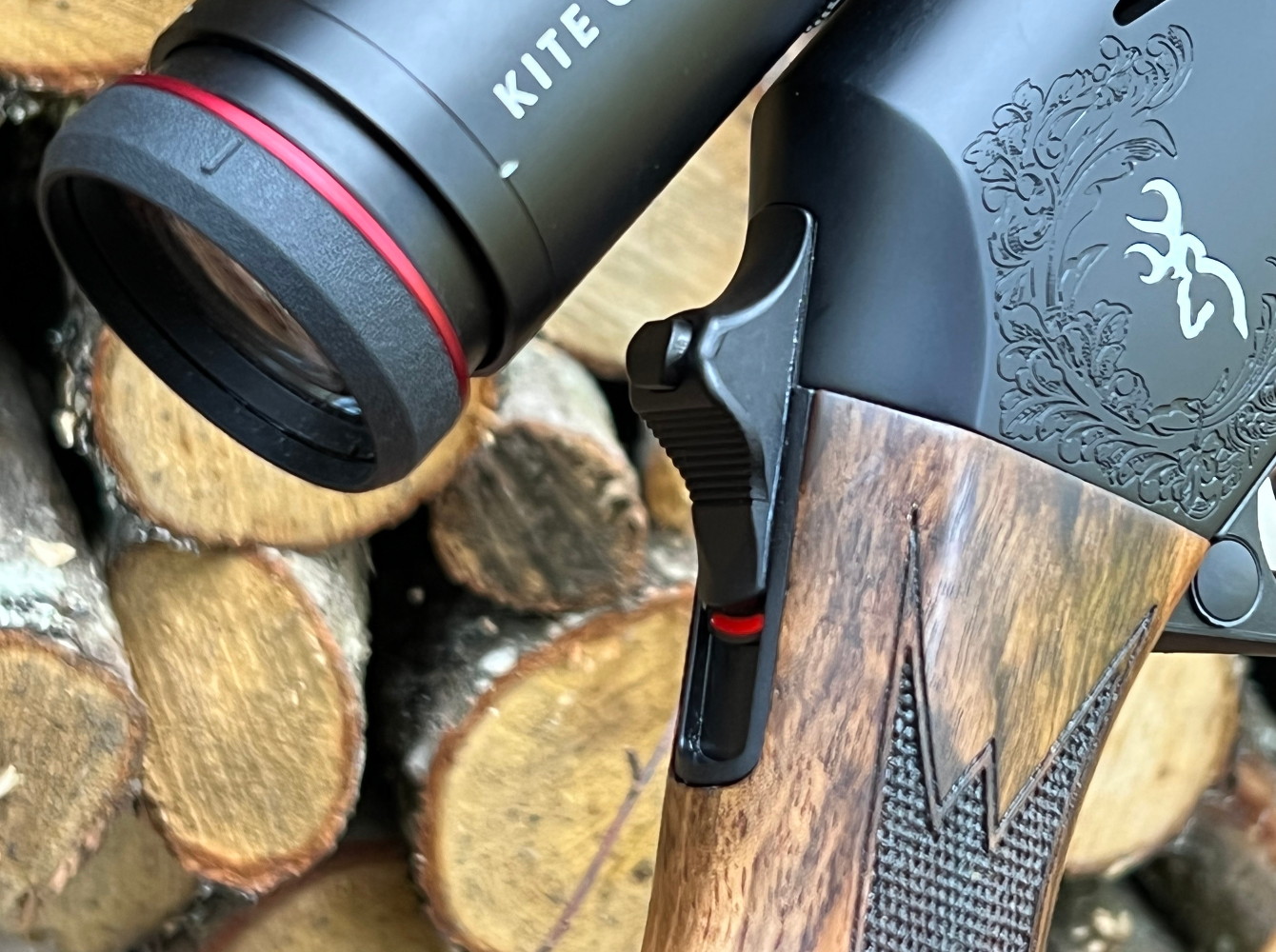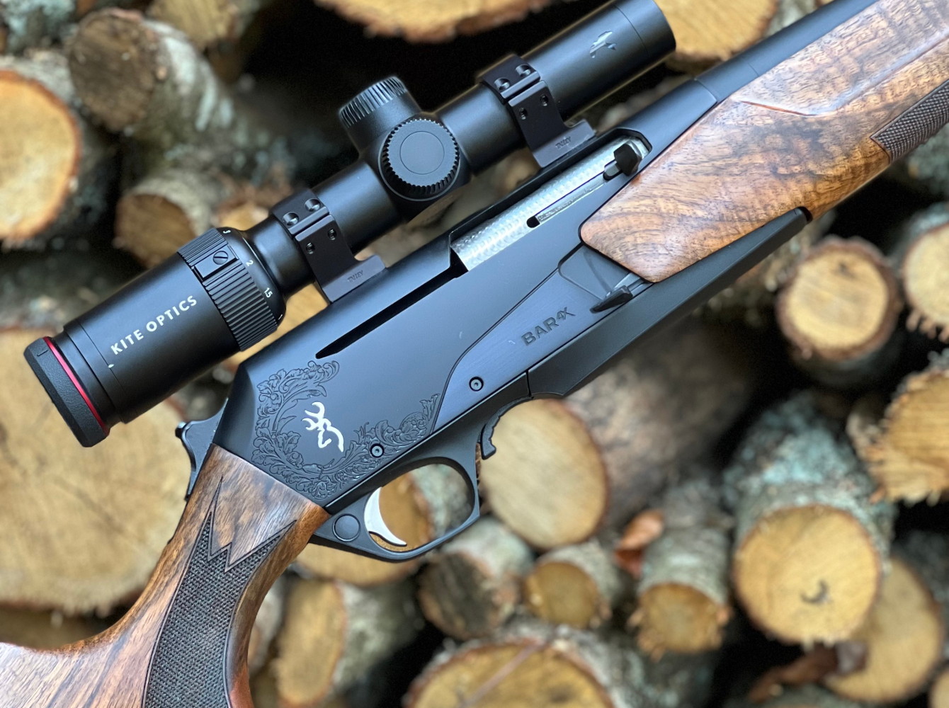 Ho poi provato la Browning Bar 4X in una condizione di tiro un po’ differente, approfittando dello shooting cinema annesso all’armeria Riffaut di Orbec, una cittadina a sud di Caen, in Normandia. La manipolazione dell’arma in un contesto di simulazione venatoria è molto utile, soprattutto quando si pianifica di affrontare una battuta di caccia con una carabina nuova. Tra i numerosi esemplari di Bar in configurazioni differenti ne ho scelta una costruita a partire dalla base Elite, caratterizzata da una carcassa anodizzata nera con leggera incisione a volute e con il logo Browning inciso a laser, di colore bianco. Il kit calciatura in dotazione era quello di tipo bavarese, in noce di grado 3, con calcio a dorso di cinghiale caratterizzato da lenght of pull di 360 millimetri e deviazione destrorsa.