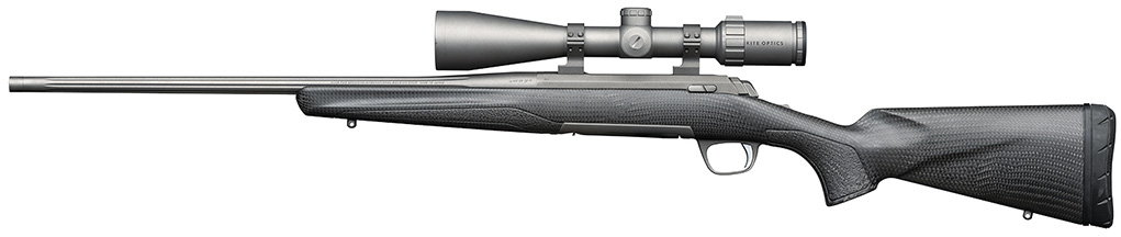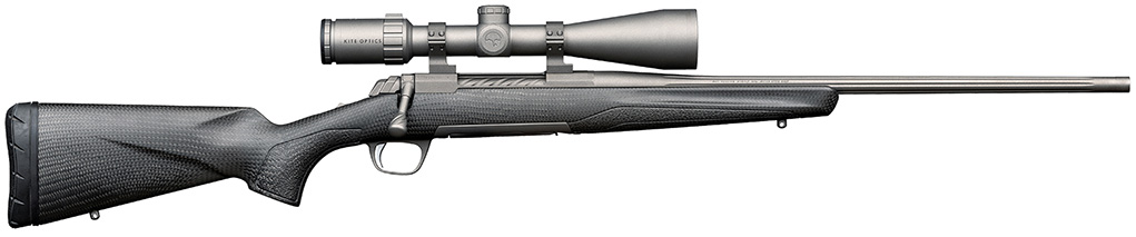 La gamma X-bolt Pro, che rappresenta il top di Browning nel segmento della ripetizione manuale a otturatore girevole-scorrevole, si distingue dal resto della produzione per l’otturatore scanalato e una qualità della canna che può a buon diritto definirsi “custom”. Il rodaggio viene infatti realizzato con particolare cura e successivi trattamenti di lappatura. La finitura Cerakote Tungsteno delle parti metalliche garantisce resistenza ad attrito, abrasione e corrosione. Il calcio in carbonio permette di contenerne il peso contenuto in 2,7 chilogrammi.