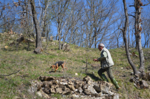 La muta di Alvaro Pelle è giunta ormai in rimessa e il canettiere osserva con attenzione l’atteggiamento di un suo soggetto che sembra particolarmente attratto da un gruppo di massi. La lepre non è lontana