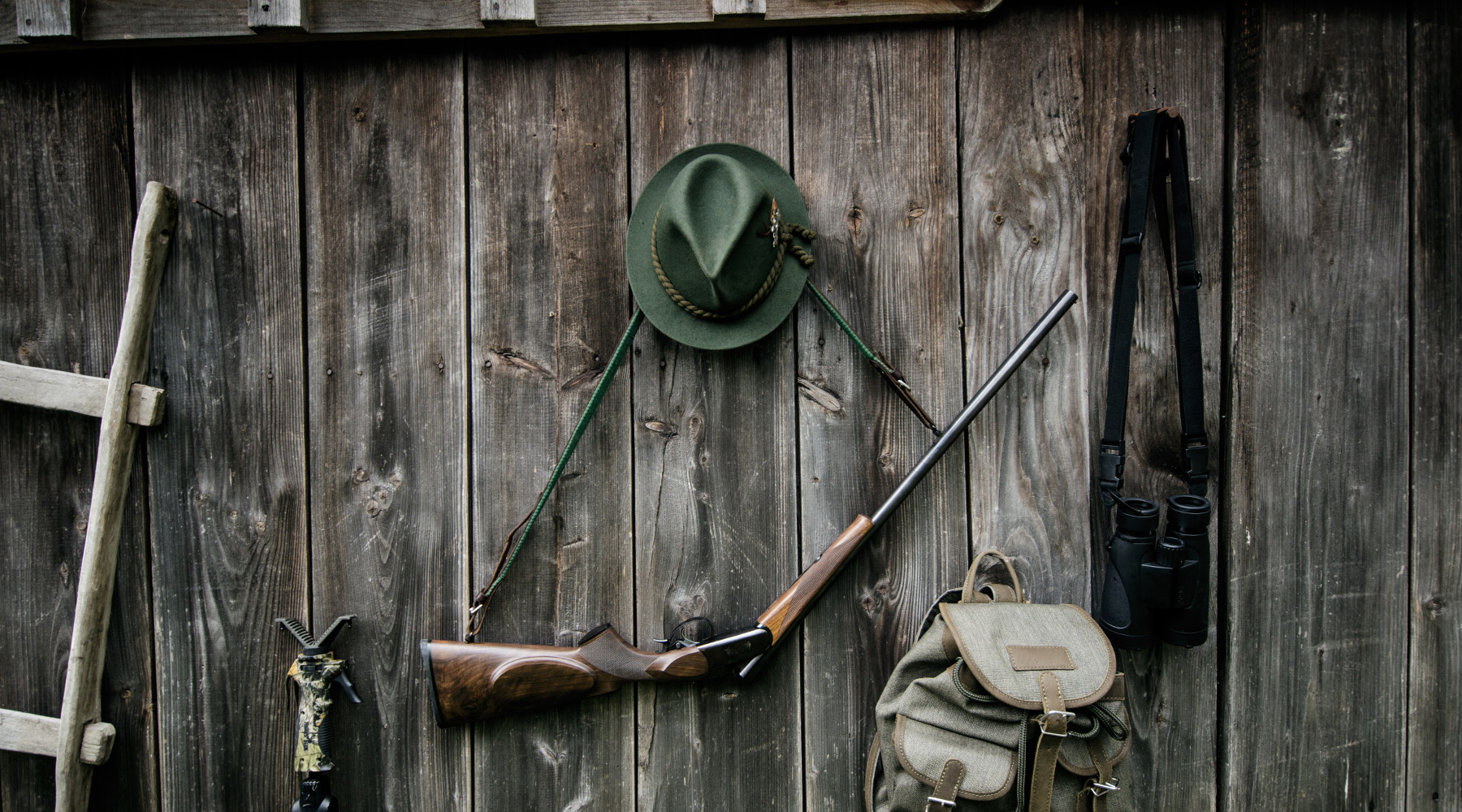 Caccia in Europa e in Italia: attrezzatura da caccia appesa a parete di legno