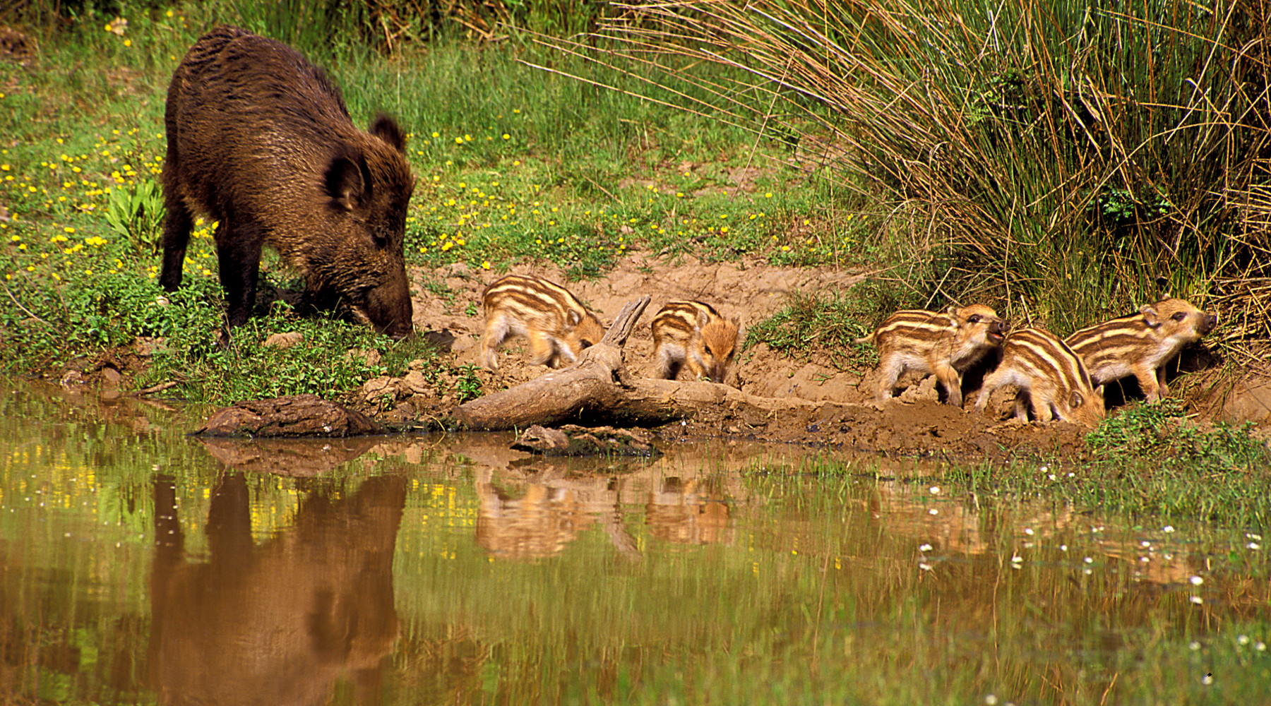 calabria proroga caccia di selezione al cinghiale: cinghiale femmina con piccoli vicino a specchio d'acqua