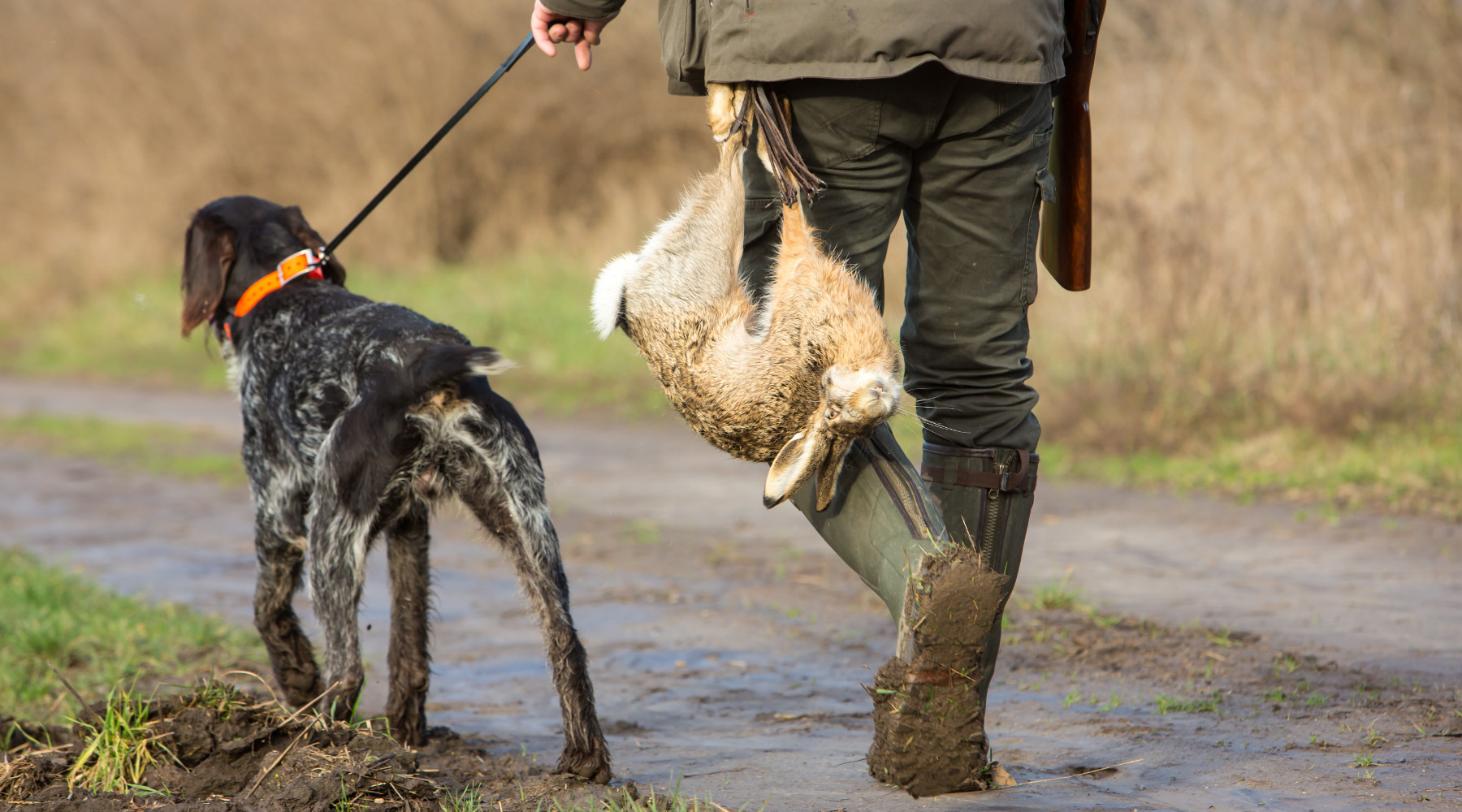 calendario venatorio della Sardegna: cacciatore con cane al guinzaglio e lepre nella cacciatora