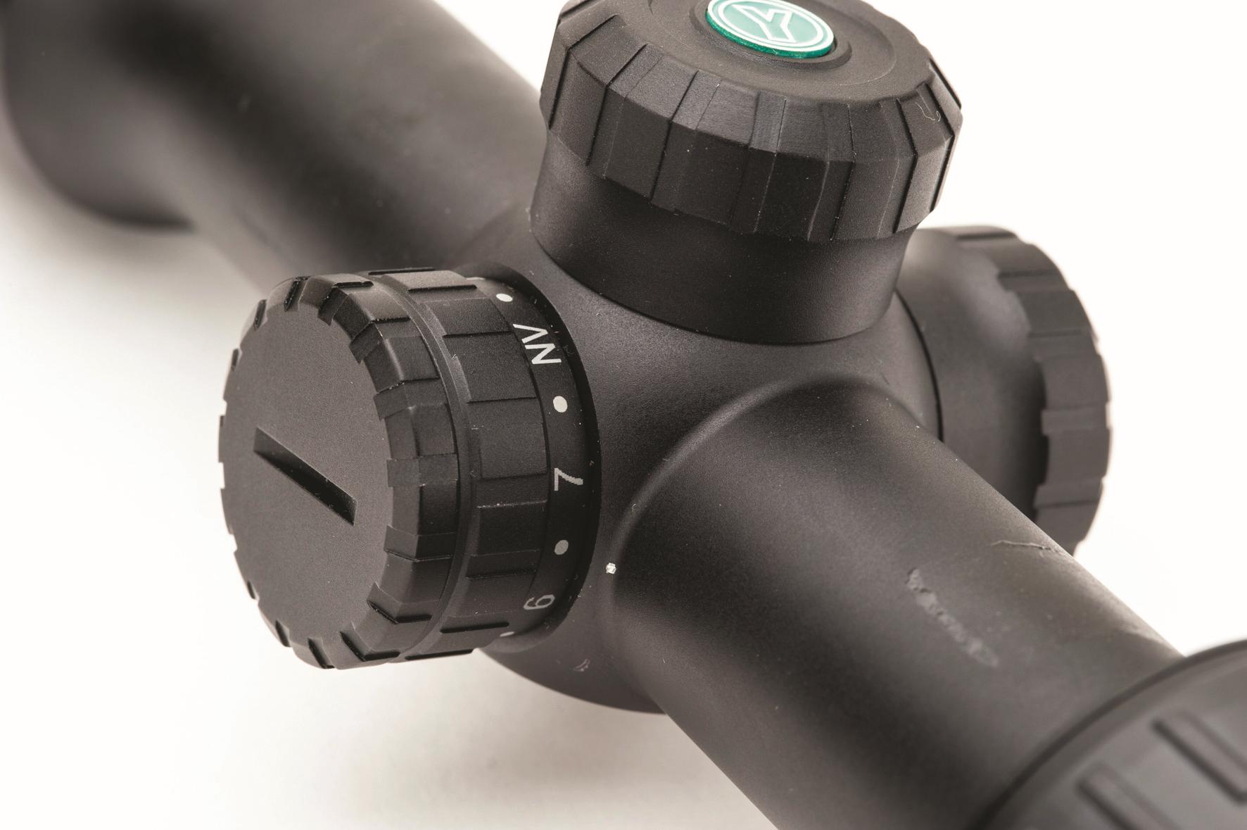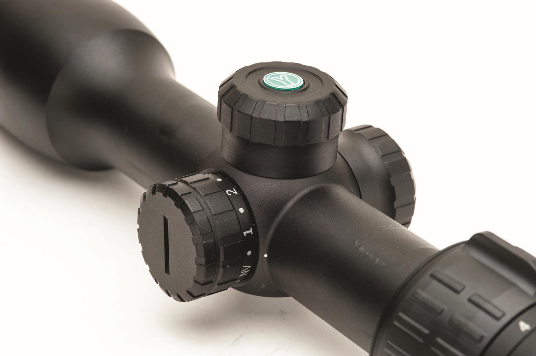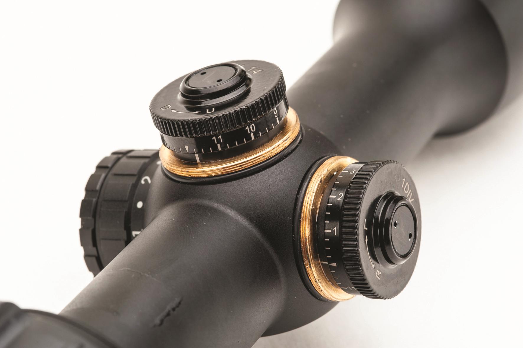 Il blocco centrale è composto da tre torrette, due delle quali demandate alla regolazione del reticolo e la terza, quella di sinistra, all’accensione del punto rosso e al contenimento della batteria di alimentazione. Sono realizzate con grande cura così come i coperchietti, che vanno a battere a contrasto con anelli O-ring che assicurano la tenuta contro le infiltrazioni. I comandi di alzo e deriva agiscono a passi di un quarto di Moa; fa eccezione il cannocchiale da battuta, dove le regolazioni avvengono a passi di mezzo Moa.