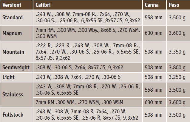 L’esemplare che abbiamo messo alla prova monta un calcio classico (denominato Halfstock in contrapposizione al Fullstock della versione Stutzen) in legno. Lo stesso calcio è utilizzato nelle versioni Mountain, Light, Semi Weight e Stainless di cui riportiamo le caratteristiche salienti in tabella. Nel 2014 è stata presentata la versione mancina, curiosamente con calcio in polimero mutuato dal modello CL II SX, e la Stutzen. Nel nostro caso, il calcio presenta una pala in stile bavarese che si fa apprezzare quando si spari con l’ottica.