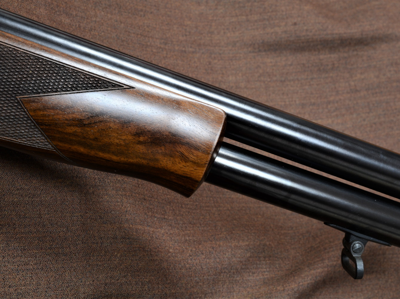 Il calcio è ovviamente realizzato in legno di noce, dalla buona pasta e con finitura a olio. Bella la scelta del legno, un grado due secondo l’attribuzione della casa madre; io mi sarei spinto in una qualifica ancora migliore viste le calde venature sapientemente risaltate dalla lucidatura a olio. La zigrinatura è eseguita manualmente e il disegno appare piuttosto classico, grippante il giusto, senza offendere il palmo delle mani.
