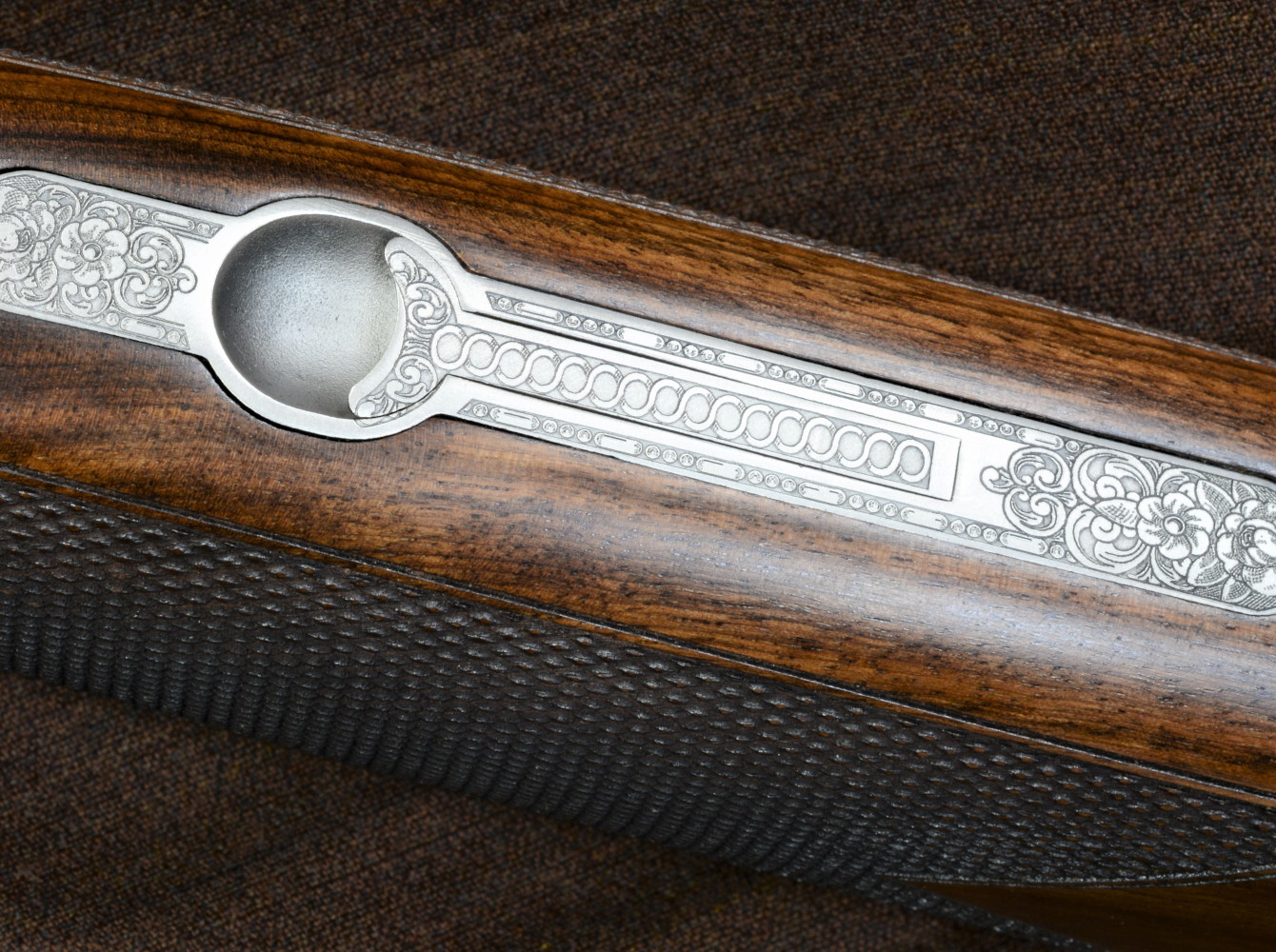Accanto a una ricca inglesina che fa da quinta, al centro dei due fianchi di bascula compare un bell’ovale che, adornato da volute floreali, racchiude una scena di caccia alla beccaccia. Sul lato destro due beccacce si librano in cielo su uno sfondo silvano, così come sul lato sinistro, ma le due coppie di animali sono raffigurate in momenti di volo differenti e realistici. Lo sfondo tratteggiato sul lato destro ricorda un bosco, mentre sul lato sinistro appare più indistinto, quasi un’atmosfera brumosa, tipica dell’ambiente autunnale. Sul petto si staglia un’altra coppia di beccacce in volo, ancora differenti, quasi a simboleggiare il momento della croule, il periodo degli amori della beccaccia. L’ovale sembra poi definire ancora meglio le scene, quasi come in un quadro d’altri tempi. Il livello di dettaglio delle incisioni risulta elevato; le proporzioni sono corrette.