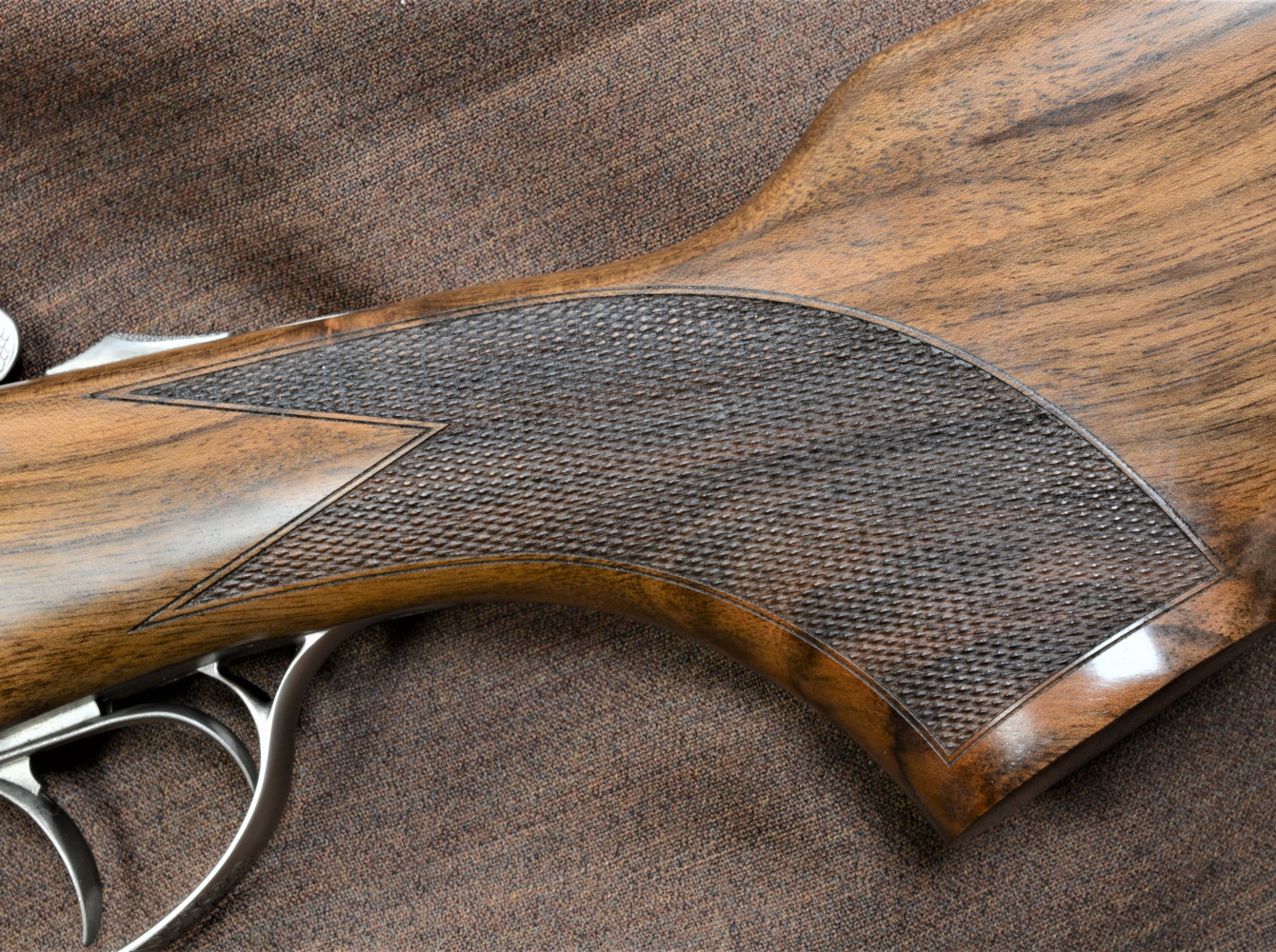- Calciatura: in legno di noce turco altamente selezionato con finitura a olio; zigrinatura eseguita a mano su impugnatura e astina; impugnatura a pistola allargata tipo Woodward; astina con sgancio ad auget e con tulipe; calciolo in legno