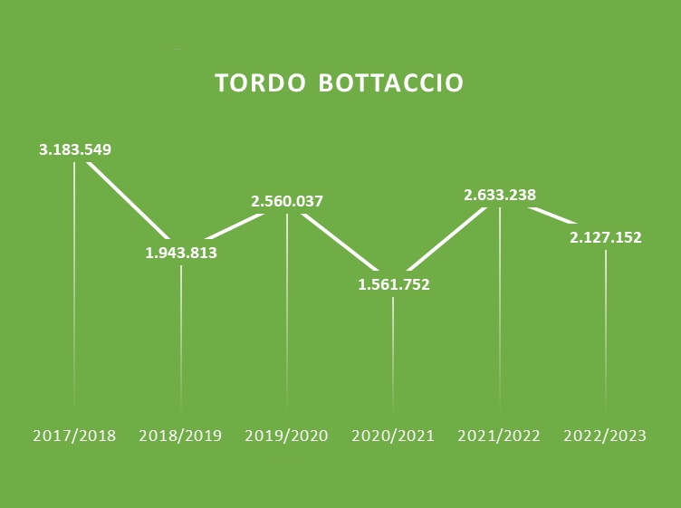 Delle trentasei la specie più cacciata, con numeri che hanno fatto indignare l’Enpa, è il tordo bottaccio, per il quale si registrano più di 14 milioni d’abbattimenti (il massimo nel 2017/2018, più di tre milioni); seguono merlo e colombaccio. L’Ispra segnala che su parte del prelievo del fagiano, la quinta specie, incidono le immissioni d’esemplari allevati, quelli che comunemente si chiamano pronta-caccia; tra le specie acquatiche i cacciatori italiani prediligono germano reale e alzavola. Il carniere complessivo della beccaccia fa registrare un andamento altalenante tra i 100.000 e i 150.000 prelievi l’anno (127.448 la media; 129.178 la mediana).