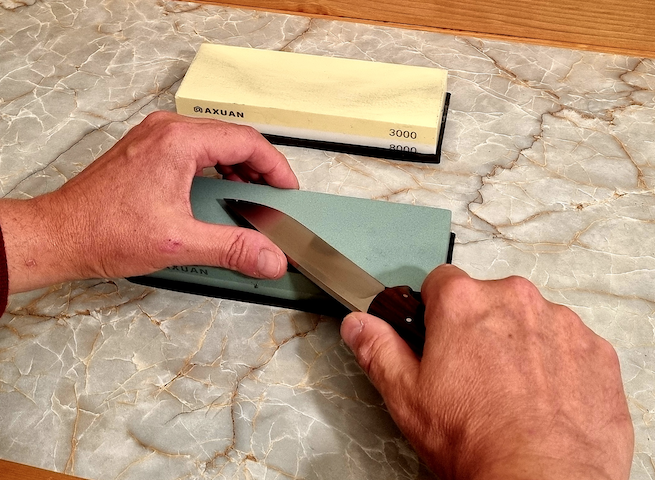 In sostanza si tratta di porre la pietra abrasiva (che avremo preventivamente ben bagnato) su un piano di fronte a noi, impugnare il coltello e spingerlo sulla pietra con un movimento semicircolare, in modo che a ogni passata tutto il filo della lama passi sulla pietra. Anche in questo lavoro dovremo però mantenere fermo il corretto angolo e qui non ci sono guide che ci possano aiutare, anche se alcune aziende producono appoggi più o meno intuitivi per mantenere ferma l’angolazione.