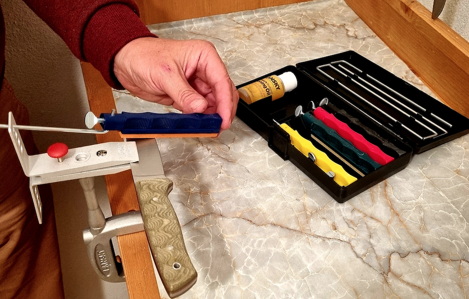 Per completezza può essere interessante sapere che esistono kit di affilatura di dimensioni e peso molto contenuti che invertono la tecnica di lavoro con la pietra. In sostanza il coltello viene tenuto fermo da appositi morsetti e le pietre (dalla più grossolana alla più fine) vengono progressivamente passate sulla lama attraverso guide angolari che mantengono fisso l’angolo di lavoro desiderato. Si tratta di strumenti di buona qualità, ma che incontrano qualche difficoltà nel lavorare su lame di dimensioni generose.