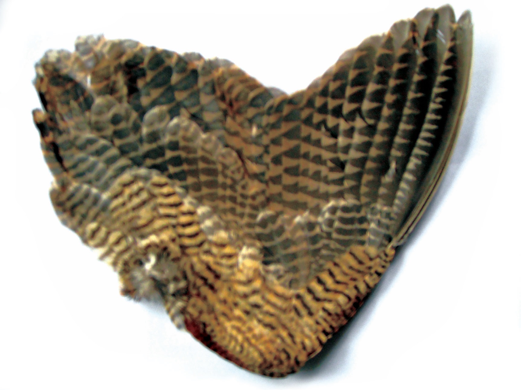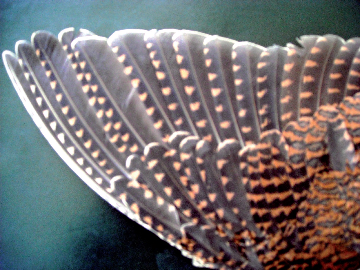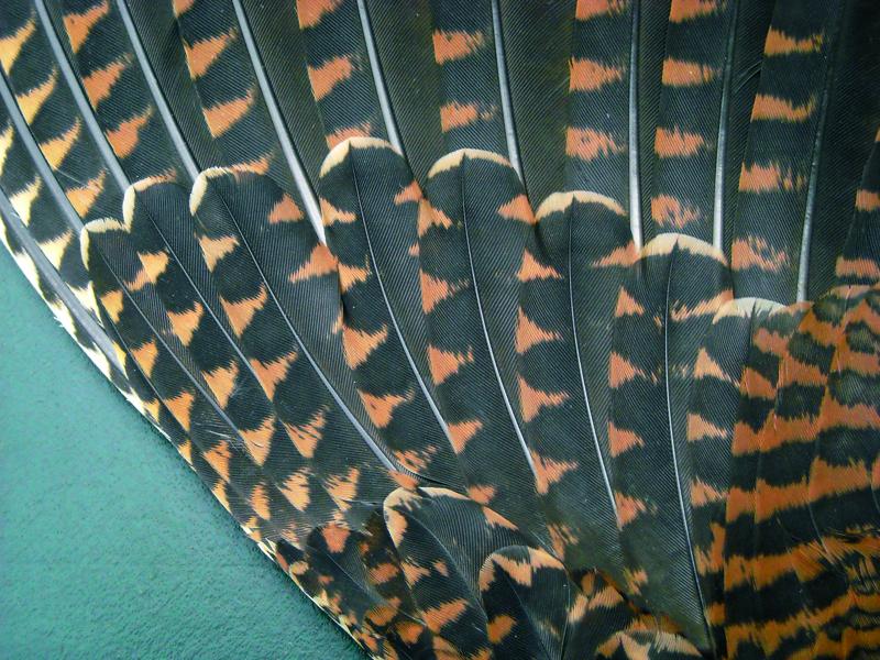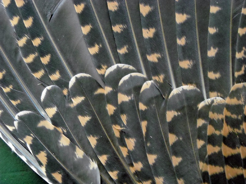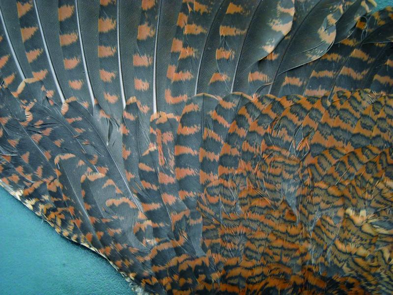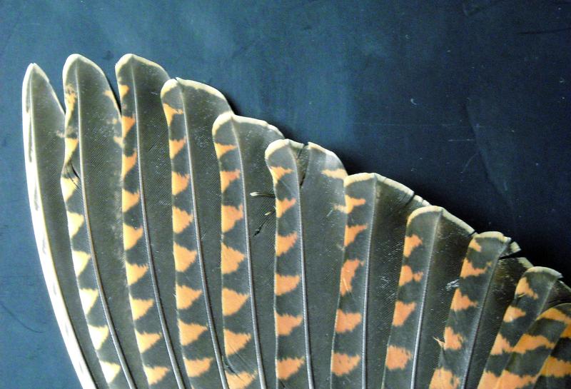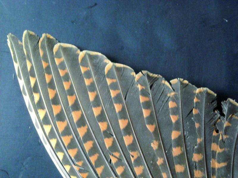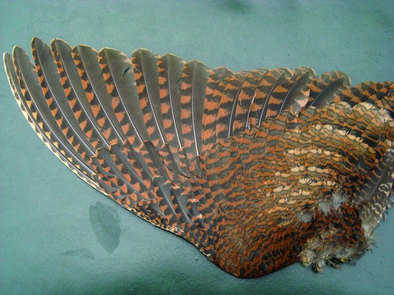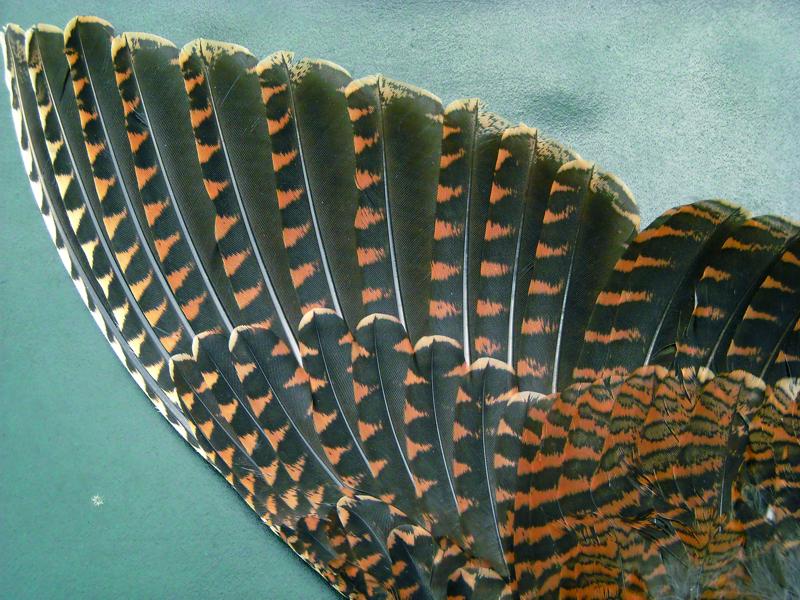 Lettura. L’ala così preparata si presenta davanti i vostri occhi come un mazzo di carte aperto. Il pollice della mano destra appoggia sullo snodo carpale, esattamente dove confluiscono le grandi copritrici primarie e secondarie. Con le dita della mano sinistra si procede a lisciare le penne, eliminando ogni sovrapposizione. Si sottopone l’ala a una fonte luminosa fissa e ravvicinata (30 cm) in modo tale da evitare errori nella percezione delle sfumature dei colori.