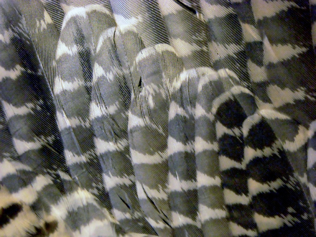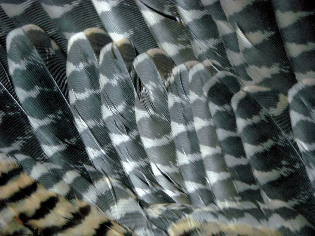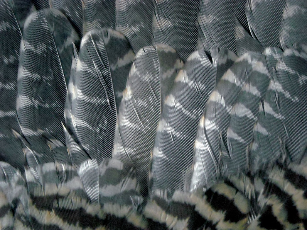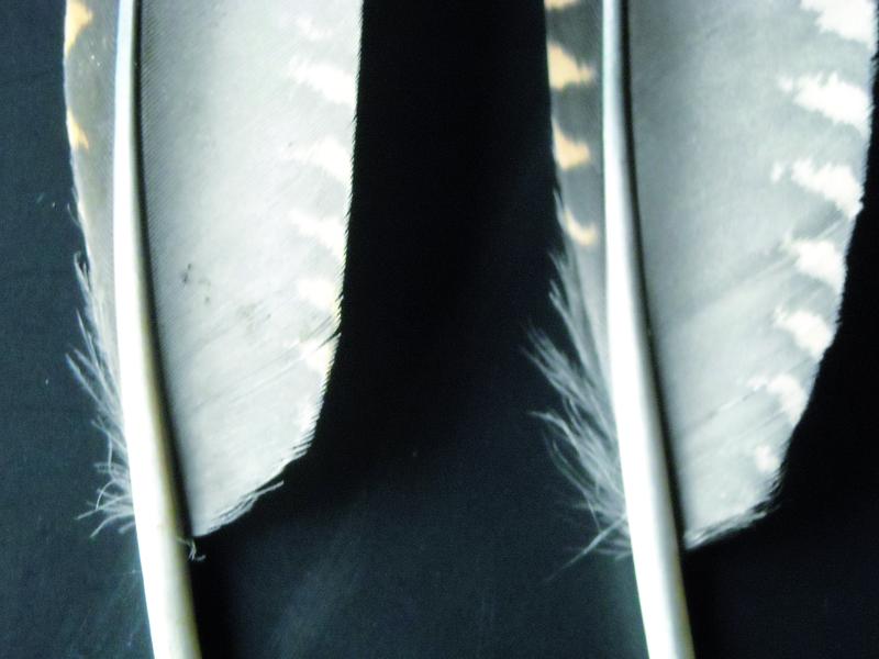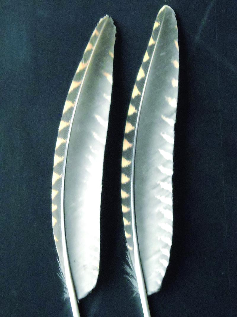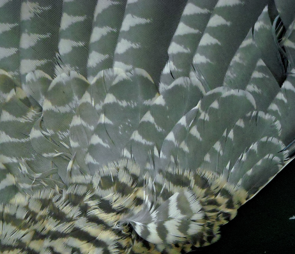 Vista dall’interno, l’ala presenta una colorazione grigia piuttosto omogenea e l’attenzione va posta sulle variazioni dei toni del vessillo, ricordandoci che, mentre nella superficie esterna di un’ala adulta le piume sono tutte mutate, nella superficie interna vi è la presenza di piume adulte, ma di “tipo giovanile”, ovvero di forma stretta, di un grigio chiaro opaco a effetto ossidato. Sono sempre piume adulte, ma non sono mutate; mentre quelle adulte mutate sono più larghe e con il disegno del vessillo di colore nero, quasi brillante.