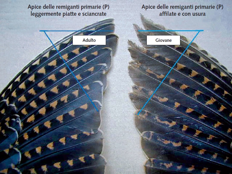 Le caratteristiche che consentono di distinguere le remiganti primarie (P) tra un uccello adulto (A) e uno giovane (J) sono: la lunghezza, maggiore, nell’adulto; il vessillo, più largo nell’adulto, fino a formare una tipica sciancratura sull’apice, facilmente visibile a livello di P7, P6, P5, P4; maggior presenza di duvet (piumino) sulla rachide a base della piuma negli adulti; pigmentazione marcata e disegno a contorni nitidi negli adulti, più tenue nei giovani.