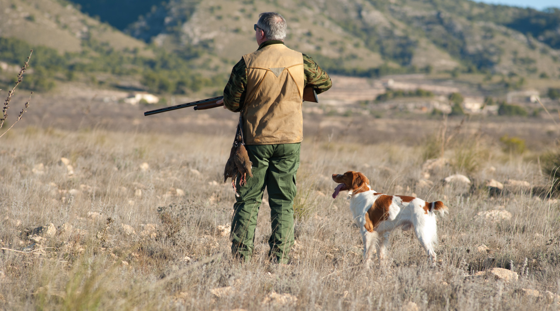 Contributi economici ai cacciatori, la risposta dell’assessore: cacciatore di spalle con cane da caccia