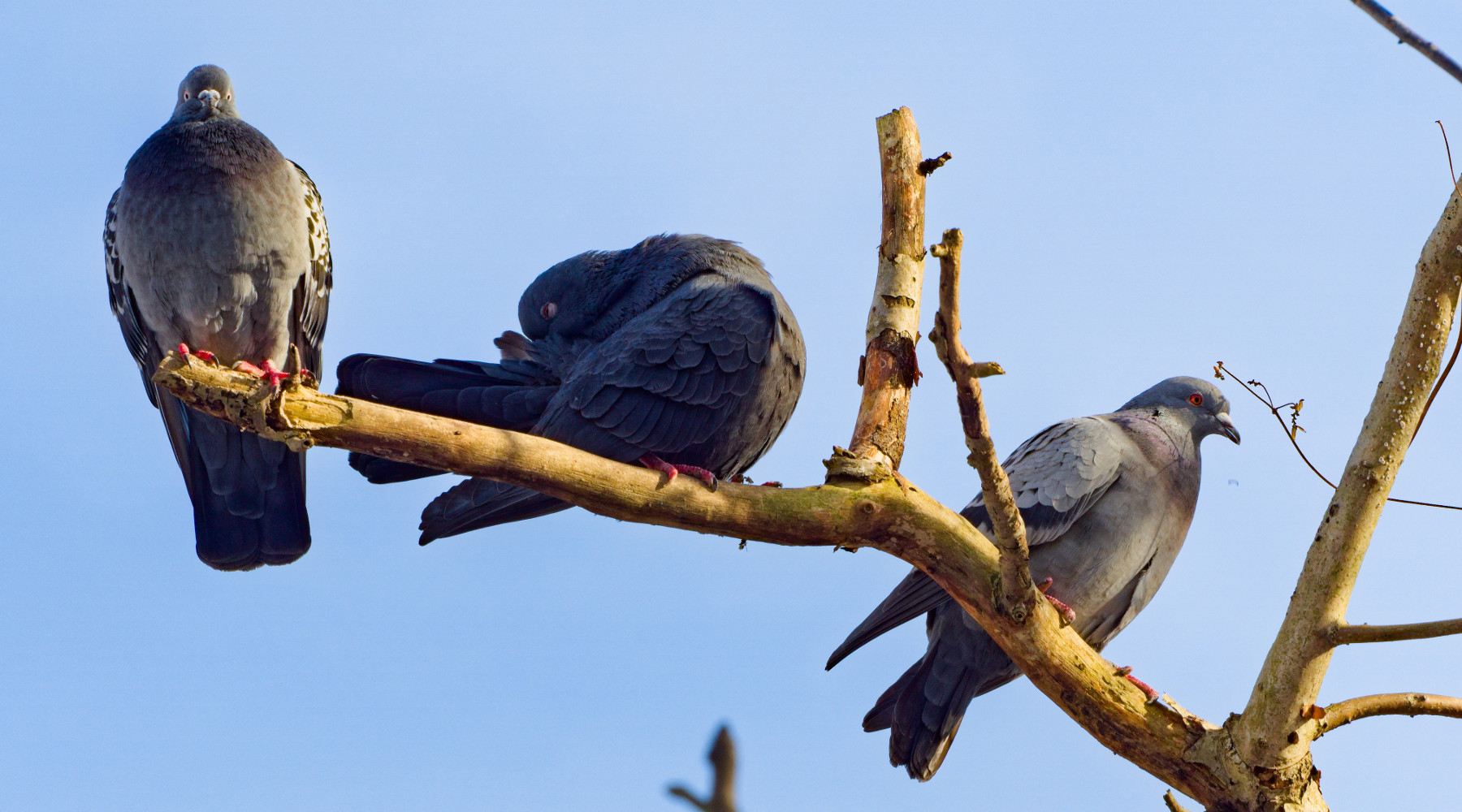 controllo del piccione di città: tre piccioni sul ramo di un albero
