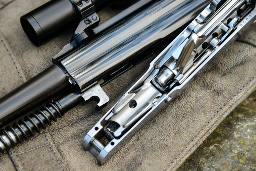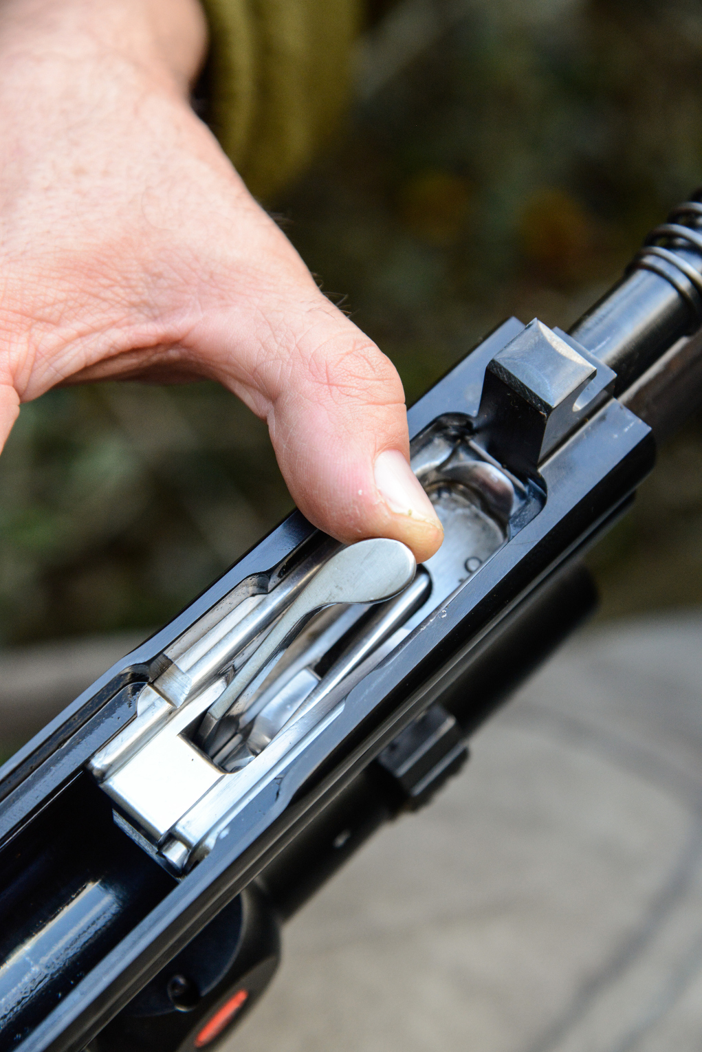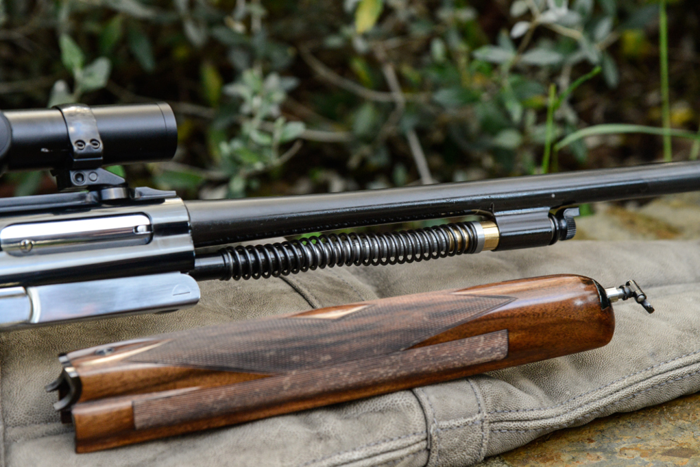 Tra le differenze va anche segnalata la bindella – fresata direttamente sulla corazza – che porta attacchi a pivot Eaw. Anche questa è una scelta che potrebbe rivelarsi non definitiva. Quel che è certo è che la canna subirà un trattamento differente dalla brunitura del prototipo: l’acciaio Krieger non si è mostrato infatti ideale per la brunitura tradizionale. La molla per lo smaltimento del rinculo e il successivo ritorno in batteria dell’otturatore è posta sotto all’asta poggiamano. È inoltre coadiuvata da un elemento elastico che funge da ammortizzatore di rinculo annullando l’effetto frusta tipico dei semiauto.
