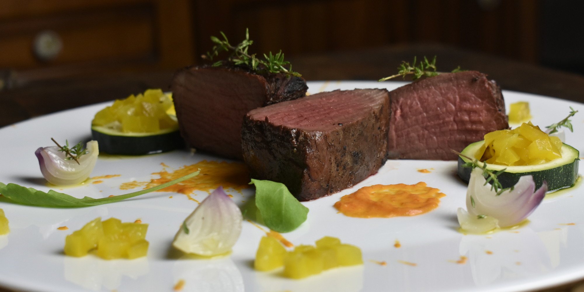 Peperoni, pomodori, cipolle e zucchine ingentiliscono il sapore del daino alla brace: ecco la ricetta.