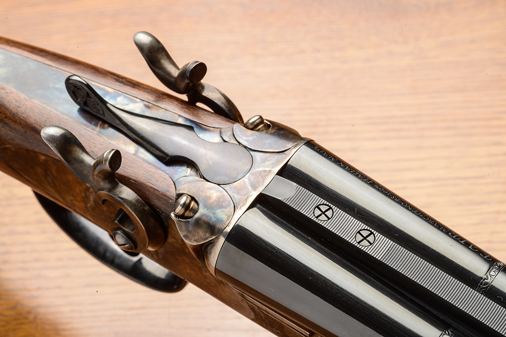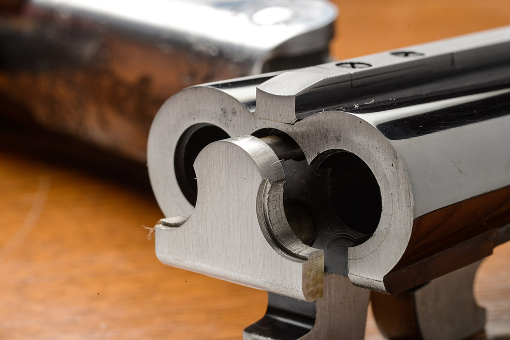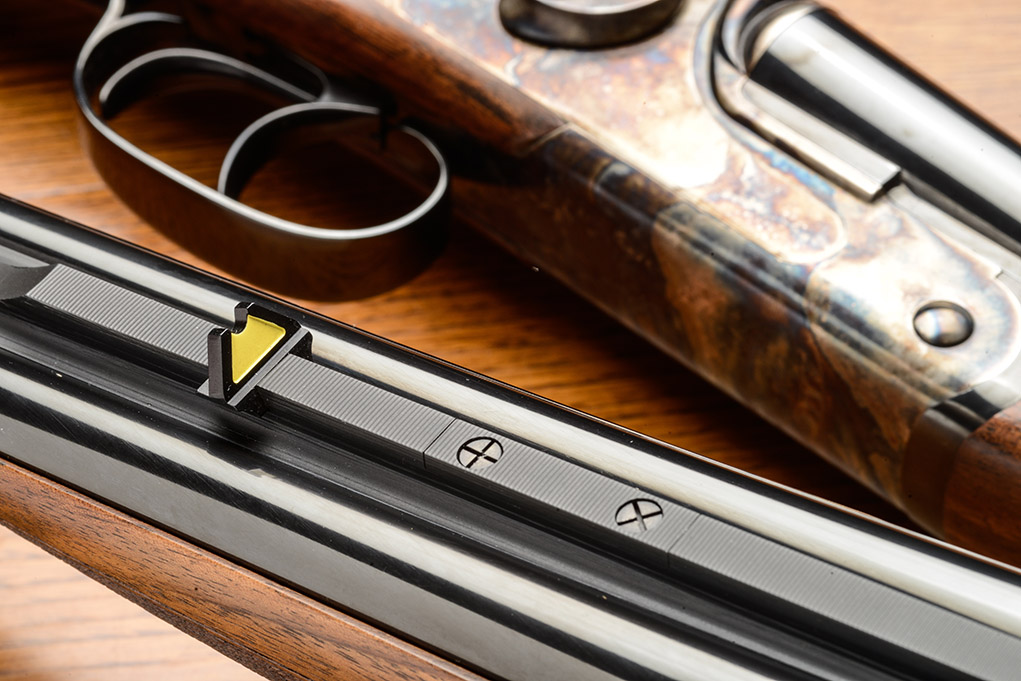 Per quanto riguarda le canne, sono realizzate in acciaio Um8 – Hd40 ad alta resistenza. Pesano circa 1.350 grammi e misurano 55 centimetri. Dispongono di estrattori manuali a grande sviluppo e di una bindella superiore da 7 millimetri, satinata anti riflesso, con la predisposizione per l’attacco dell’ottica. Le mire metalliche si avvalgono di una tacca a V e di mirino registrabile con inserto in fibra ottica di colore rosso. La convergenza è ottimizzata durante il processo di saldatura sui 50 metri ma è disponibile un registro che agisce su dei cunei, alla volata, ricoperto di una leggera saldatura a stagno che serve a preservare la corretta regolazione e inibisce al tempo stesso interventi fai-da-te. Per questo tipo di regolazioni è infatti raccomandabile affidarsi all’opera di un armiere esperto. La brunitura finale è di colore nero brillante, come enfatizzano le immagini a corredo di questo articolo.