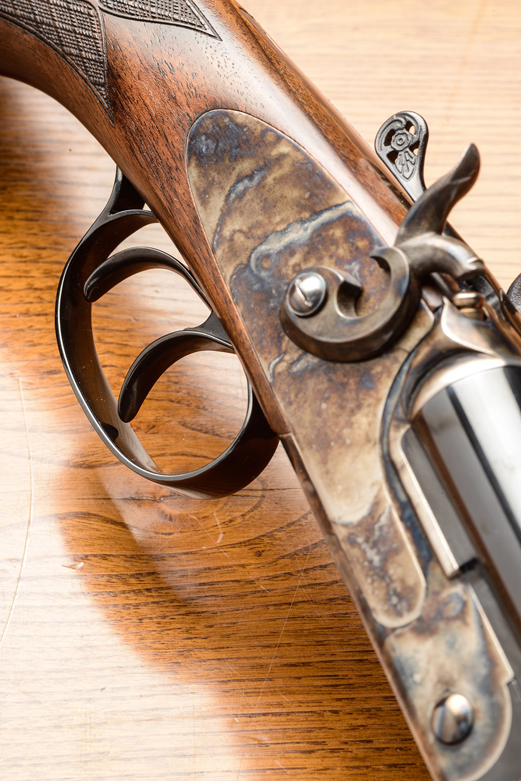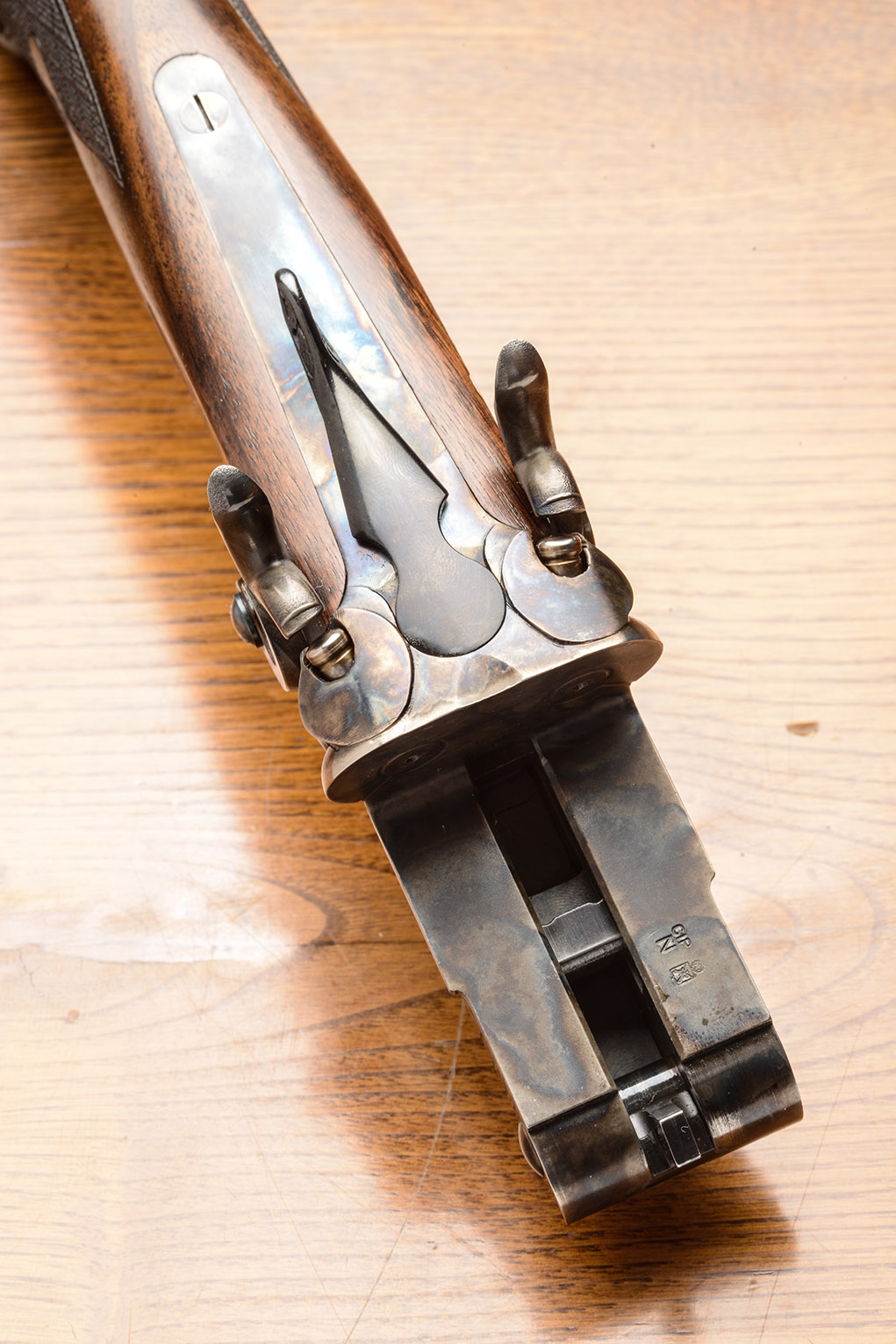 La sicura, disposta come consueto sulla coda della bascula, è manuale e blocca i meccanismi di scatto. La chiusura si affida a un tassello trasversale di grande dimensione su doppio rampone, azionato da una manetta d’apertura traforata e poi brunita.
