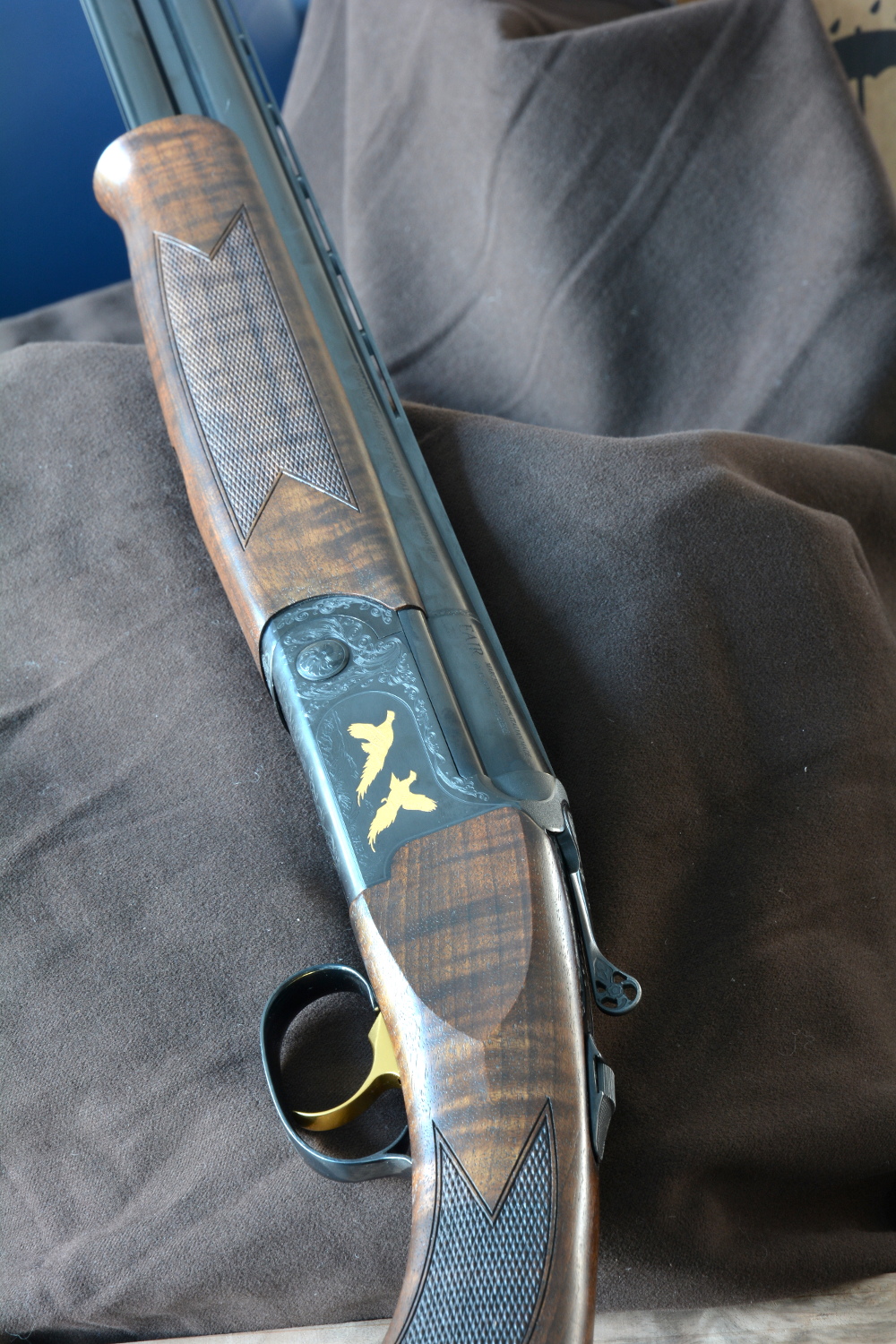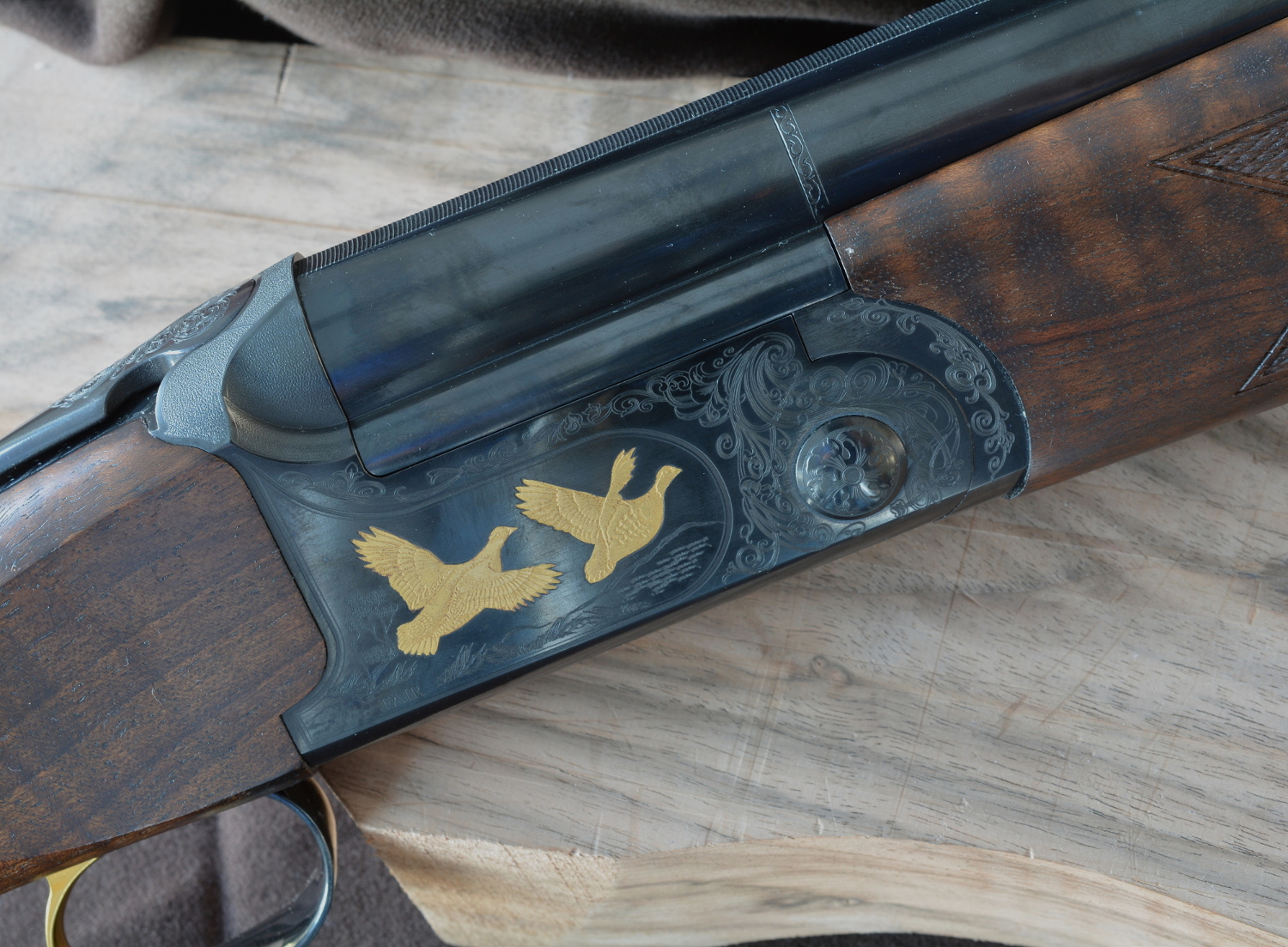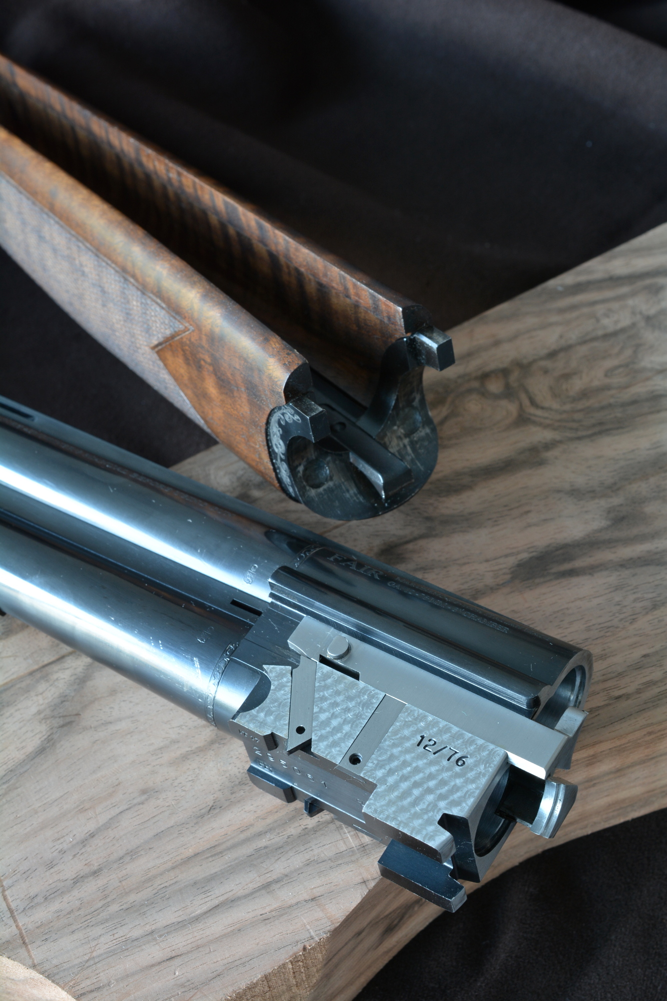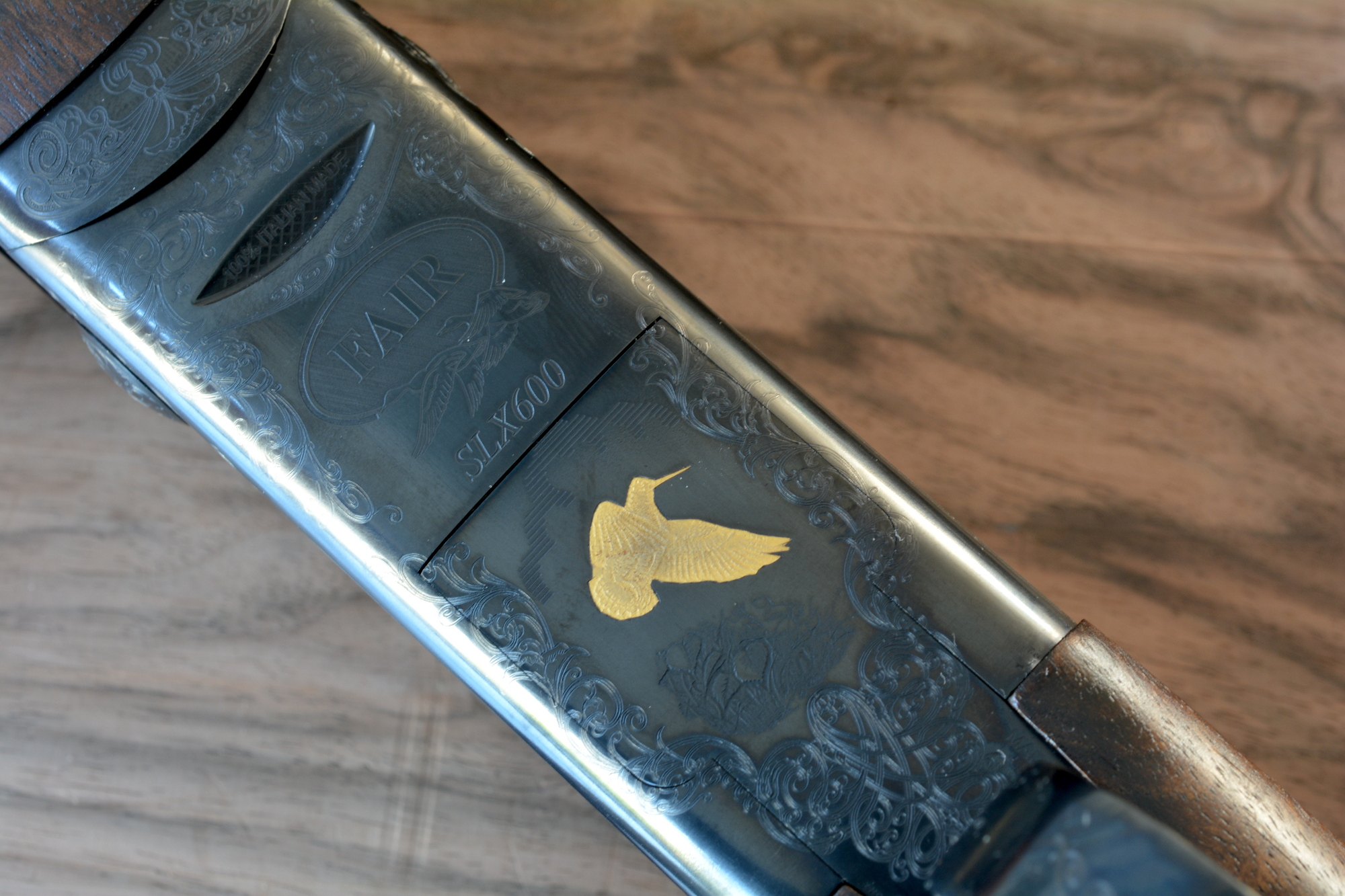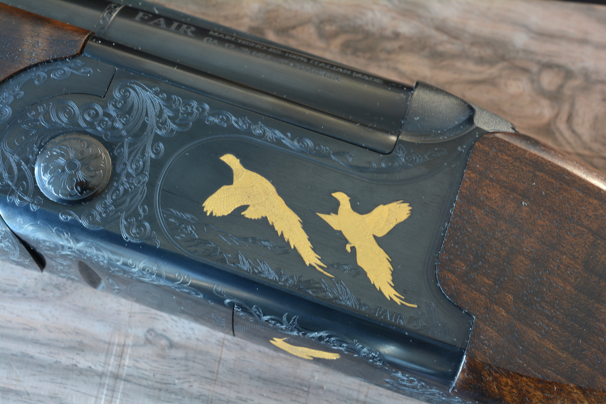 L’eccezione è rappresentata dalla presenza di riporti in oro sui fianchi e sul petto di bascula. Due fagiani in volo sul lato sinistro e due starne in volo sul lato destro contribuiscono a spezzare la cromia nera. Sul petto spicca invece una beccaccia, anch’essa in oro e in volo, oltre alla sigla identificativa del modello e al marchio aziendale, le due consuete anatre in volo sotto l’ovale Fair. Si possono osservare anche delle sottili incisioni eseguite al laser, che la Casa definisce “a triplice profondità”. Pur se scarsamente visibili a causa della brunitura, vanno ad abbellire ulteriormente la componente metallica. Gli animali riportati in oro (galvanico) non sono disprezzabili, anche se il dettaglio più fine all’interno dell’incisione è, per ovvi motivi di costo e di realizzazione, meno visibile rispetto a un dettaglio realizzato a mano da un maestro incisore.