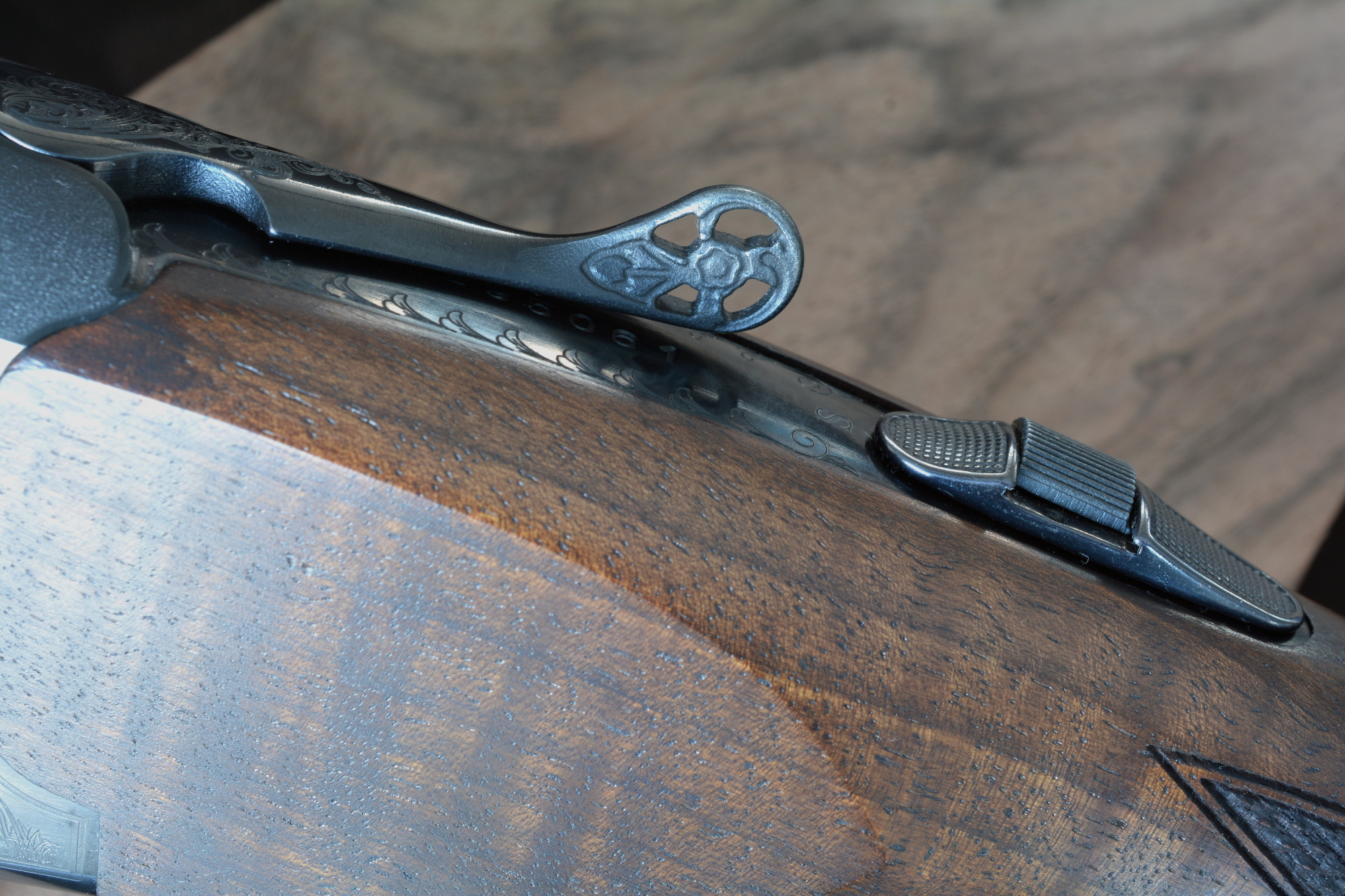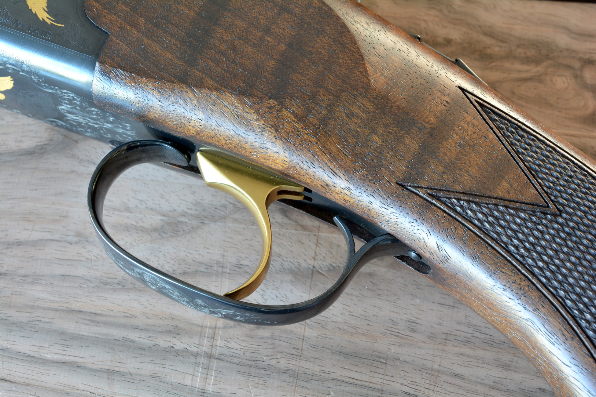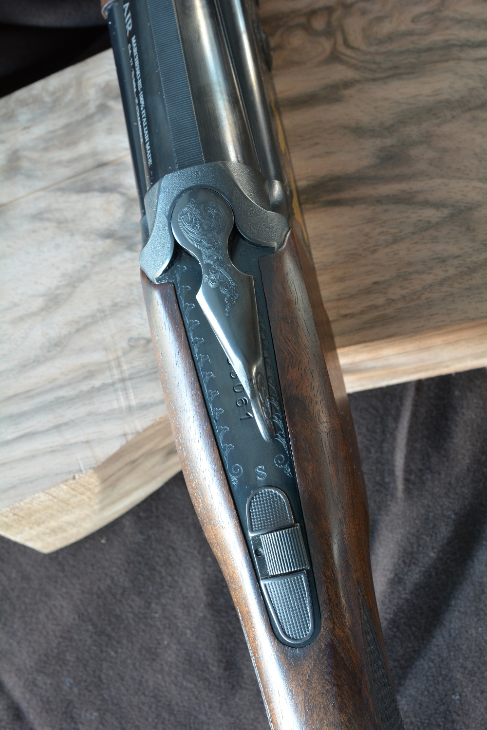 Il ponticello, sempre brunito nero come il resto della minuteria, è di dimensioni consone a un utilizzo venatorio, anche quando il freddo pungente può convincere i cacciatori più riottosi a indossare un paio di guanti. Il monogrilletto selettivo è dorato, a contrasto di colore con le restanti parti metalliche. La sua foggia è piuttosto classica, ma non per questo meno godibile nell’utilizzo quotidiano. La pala cade infatti con naturalezza sotto la falange del dito indice. La faccia ventrale del ponticello, così come altri particolari metallici, reca una leggera incisione. Per la sua leggibilità valgono i discorsi di prima a causa della brunitura diffusa. I perni cerniera, secondo tradizione Fair, sono bombati, incisi e sostituibili all’occorrenza.