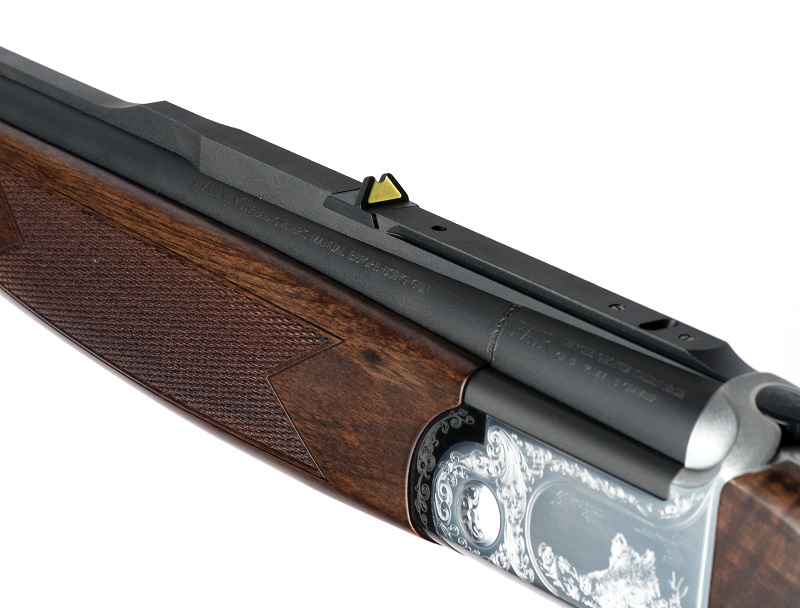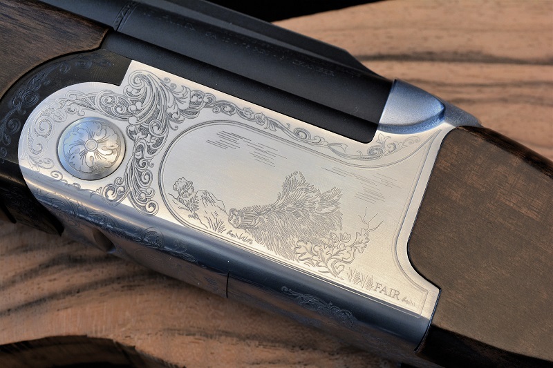 I due lati di bascula, realizzata in acciaio 16 trilegato ricavata da un massello forgiato, cementata e temprata con finitura argento vecchio per cromatura, presentano una delicata incisione, eseguita a laser e definita dall’azienda “a triplice profondità”, a tema; possiamo infatti osservare una testa di cinghiale che fa capolino da un rametto e su uno sfondo rappresentato da montagne e alberi. Il tutto è molto lieve, quasi tratteggiato; a voler essere pignoli non si obietta quasi niente circa l’incisione quanto l’espressione del cinghiale, che non sembra quella bestia feroce che spesso vogliamo dipingere. Attenzione, però; sul campo le cose vanno diversamente e alcuni esemplari ispirano tutto meno che la serenità e la fiducia istintiva. L’incisione è completata da alcuni riccioli e festoni che si estendono nella porzione anteriore dei due lati di bascula. La scritta “FAIR” fa capolino nella parte posteriore della stessa, quasi defilata e nascosta in un ciuffo di vegetazione. I perni cerniera, come da tradizione FAIR, sono bombati e incisi. Più articolato il petto di bascula: accanto ai riccioli e ai festoni che adornano la scena, si trova l’incisione di un bel maschio di capriolo, anch’esso tratteggiato, ma ben riconoscibile. Poco sopra, la sigla identificativa dell’arma (SLX 600) e il simbolo aziendale, due anatre in un ovale in bassorilievo. Per esprimere un concetto già ricordato in occasione delle prove dei fucili da tiro della Casa, non è certo possibile cambiare il logo per un fucile specifico, ma due anatre su questo fucile onestamente sono poco appropriate. Per fortuna che il resto del fucile è convincente, eccome se lo è. Nella fossetta che accoglie la parte metallica della croce dell’astina all’apertura del basculante si nota la scritta “100% Italian Made”, una giusta rivendicazione della paternità nostrana. La zona di congiunzione fra la parte lignea del calcio e quella metallica della bascula è piuttosto classica, ma ben fatta, così come l’incassatura nelle altre parti dell’arma. La chiave di apertura, brunita come il resto della minuteria, presenta una leggera incisione sulla sua superficie e una palmetta traforata a quattro fori che offre una buona superficie di appoggio alla falange del pollice; il cursore della sicura si trova dove ci si aspetta che sia, vale a dire sulla codetta di bascula. Incorpora il comando per l’inversione dei cani, ottenibile grazie a un cursore godronato perpendicolare al primo. Le dimensioni del comando sono buone e facilmente azionabili senza risultare ingombranti; l’unico appunto che si può muovere è la mancanza di un punto di vernice rossa per evidenziare la canna che spara per prima. Sono dettagli che possono migliorare, ma che non inficiano minimamente le prestazioni balistiche. Il numero di matricola è osservabile quando si apre il basculante, agendo sulla chiave di apertura. Il ponticello, inciso nella sua faccia ventrale, è di forma classica (ovale), piuttosto ampio; il dettaglio non è da poco, se pensiamo alle lunghe attese alla posta, quando l’inverno ci suggerisce di indossare un paio di guanti. All’interno un monogrilletto selettivo dorato; su richiesta è possibile disporre del classico bigrillo ma, onestamente, su questa tipologia di arma non se ne ravvede la necessità.