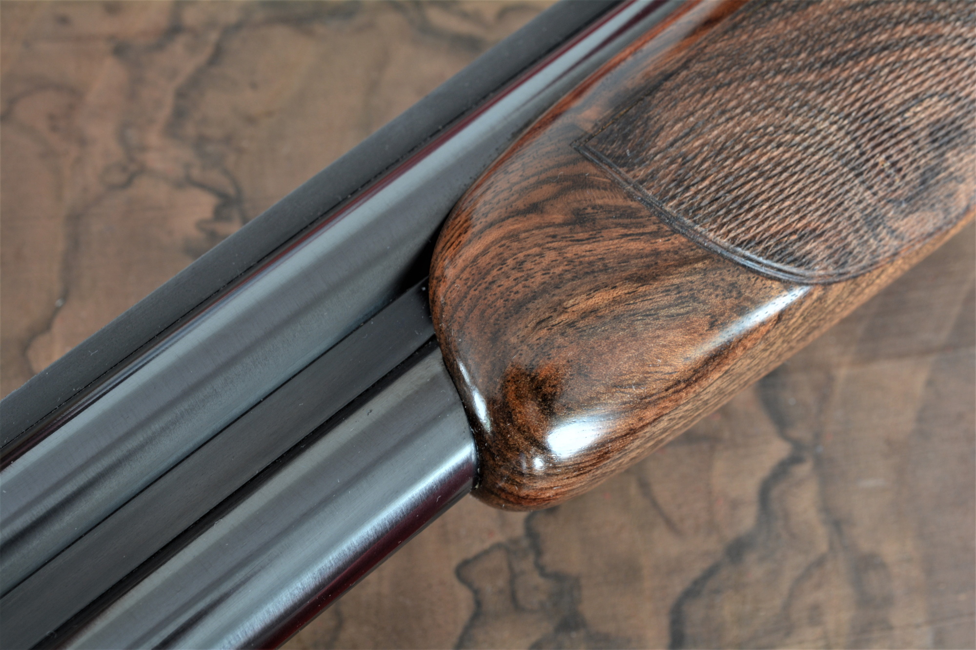 La zigrinatura su impugnatura e astina è realizzata manualmente a passo fine e, pur non risultando innovativa, appare ben eseguita. Sulla parte ventrale dell’astina la zigrinatura abbraccia, con un incrocio sinuoso, la linea mediana. La lop del fucile è settata di fabbrica a 370 mm. Eleganti le coppette dei seni, tirate lisce e lavorate con perizia e maestria.