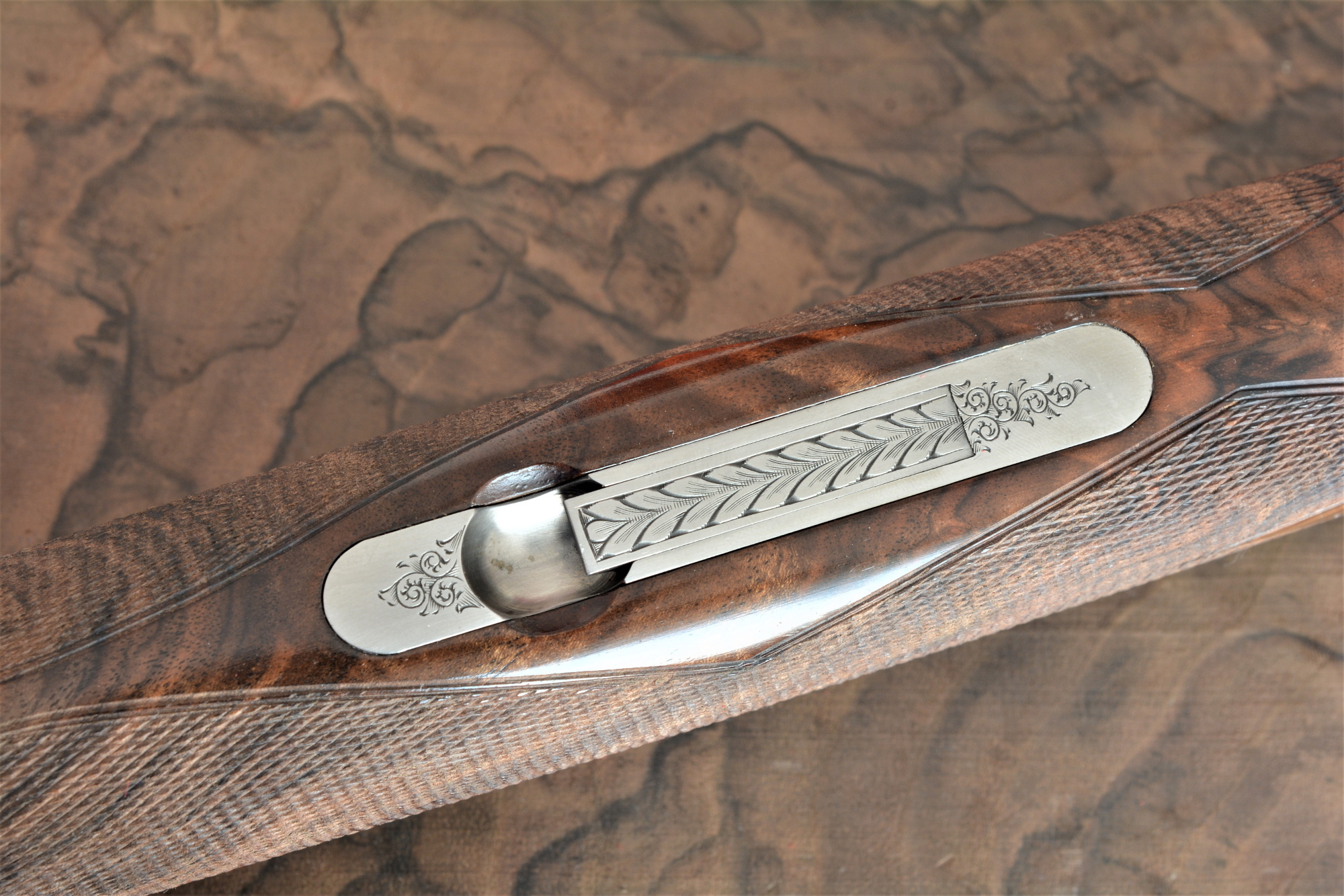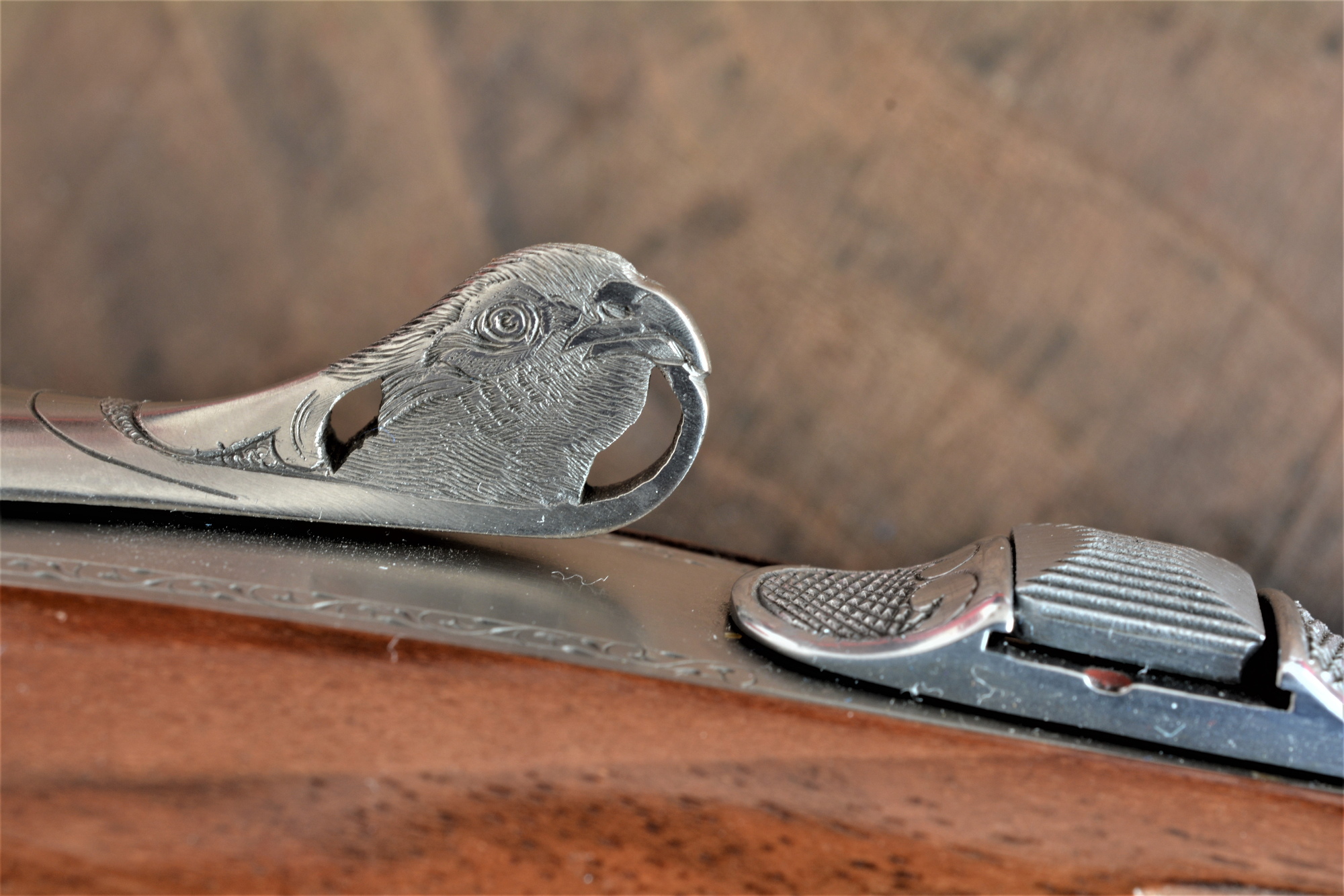 Più elaborato il petto di bascula dove, accanto all’incisione floreale e decorativa con riccioli di inglesina, si riscontra anche la rappresentazione di un fagiano maschio in volo, praticamente contornato dalla scritta identificativa dell’arma. È il modo per attribuire la destinazione d’uso. La si ritrova anche nella parte superiore del fucile, nei pressi della codetta di bascula. La chiave di apertura è infatti molto pregevole, costituita dalla testa di un fagiano veramente ben eseguita e caratterizzante la coppia di fucili. L’appoggio della falange del pollice, pur in assenza di una zigrinatura propriamente detta, non manifesta problema alcuno.