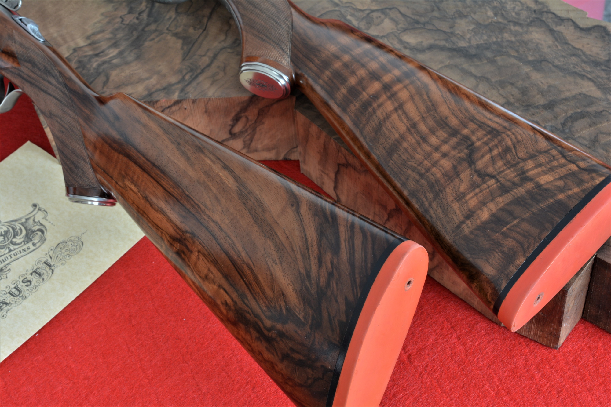 Due fucili di alto lignaggio non possono non disporre anche di un abito adeguato e Fausti non si fa certamente trovare impreparata. Un caldo legno di noce riccamente venato e finito a olio (grado 4 C, secondo la classificazione Fausti) è una scelta preziosa e raffinata, degna dell’arma. Un’altra caratteristica (quasi) imprescindibile di tutte le coppie di armi che si rispettino è l’uniformità di calciature e astine, non soltanto per un mero fatto estetico pur se importante nell’economia di una coppia, quanto per una coincidenza delle forze del rinculo generantesi allo sparo.