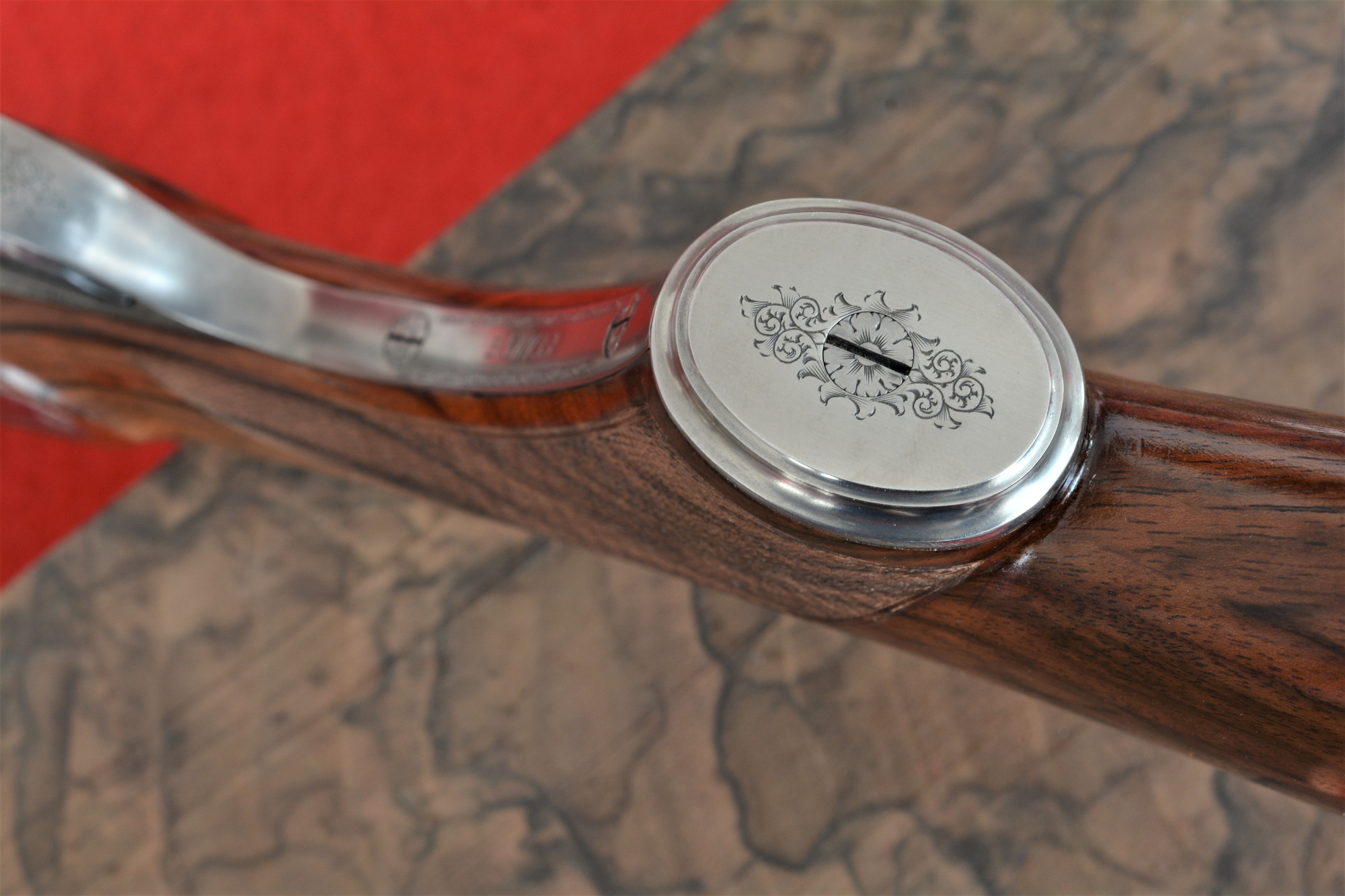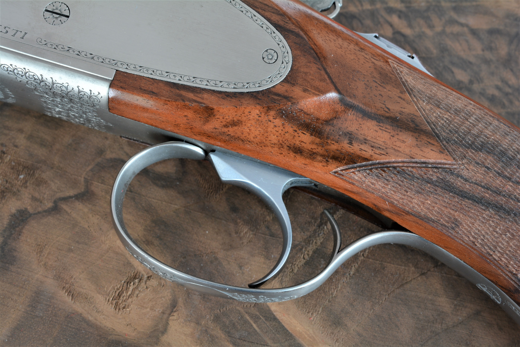 Finitura: finitura argento vecchio con bordini di decorazione, festoni floreali e fagiano inciso sul petto di bascula; incisioni manuali firmate dai maestri incisori