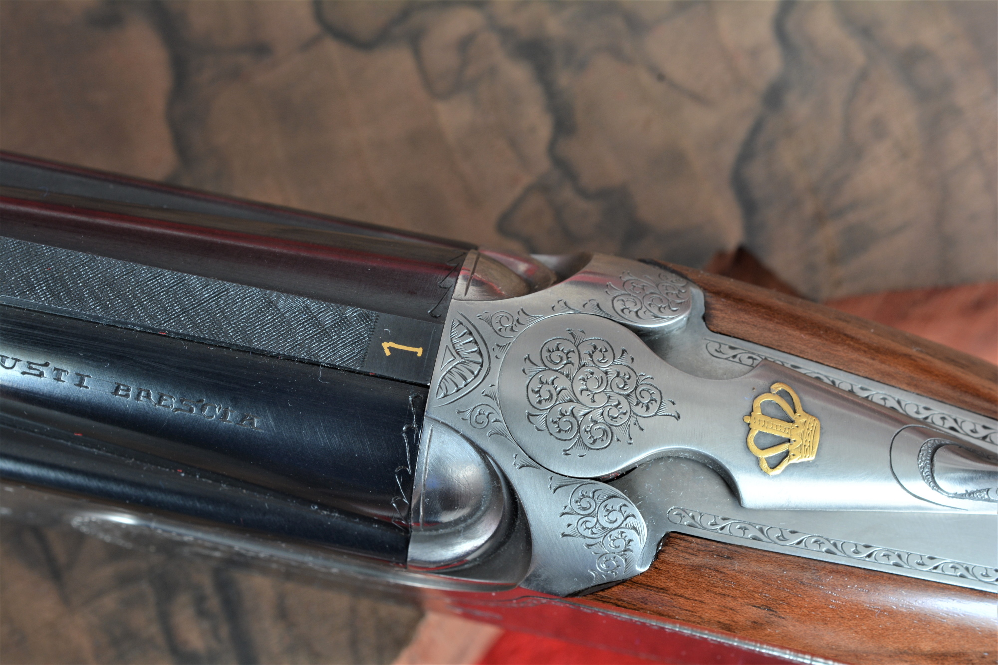 La canna superiore, la seconda, reca la scritta “Fausti Brescia”: senza riporti in oro, rimane non molto visibile. In compenso i numeri 1 e 2 fanno la loro comparsa, in oro, proprio all’inizio della bindella, a rafforzare il concetto di coppia con cui questi fucili vengono allestiti e venduti. La bindella, rabescata antiriflesso è piana, senza ponticelli, così come i bindellini laterali che uniscono le canne. La larghezza della bindella è di circa 6 millimetri e termina con un mirino sferico in ottone, assolutamente in linea con la destinazione d’uso dell’arma: un mirino in fibra ottica, certamente più visibile, avrebbe stonato.