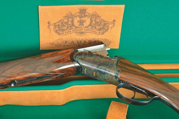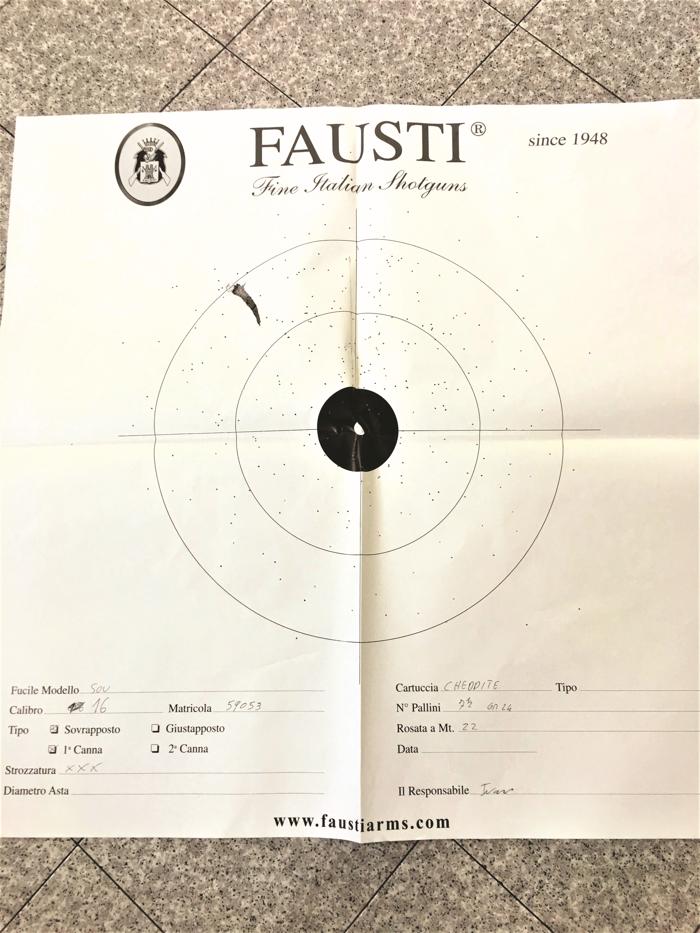 Le batterie sono delle classiche box-lock ma evidenziano un altro marchio di fabbrica della Fausti, ossia la chiusura Four locks, brevettata e utilizzata su numerosi fucili della gamma e contraddistinta da una doppia coppia di ramponi che rende il sistema di chiusura oltremodo efficiente. Quando si chiude (e si apre) il sovrapposto, la sensazione è di una grande solidità. I percussori sono montati su molle a spirale. L’estrazione dei bossoli spenti è automatica. La lunghezza standard delle canne è di 71 centimetri (26”) e sull’esemplare in prova il loro peso ha fatto fermare l’ago della bilancia sui 1.190 grammi; la coppia di strozzature fisse è 3/1 ma personalizzabile, su richiesta, con altri valori, come 4/2. Le geometrie interne di foratura prevedono coni lunghi di raccordo per assicurare rosate di tutto rispetto: va sottolineato che Fausti allega sempre una rosata certificata di sparo con tutti i suoi fucili, a testimonianza dell’effettiva resa balistica. Gli estrattori sono automatici. Le canne, realizzate in acciaio trilegato, sono innestate sul manicotto finito a bastoncino; nel punto di saldatura è visibile un leggero cordoncino. Sono accoppiate a bindellini laterali pieni e superiormente si nota una bindella, anch’essa piena, da 6 millimetri rabescata antiriflesso. Il mirino terminale è sferico in ottone.