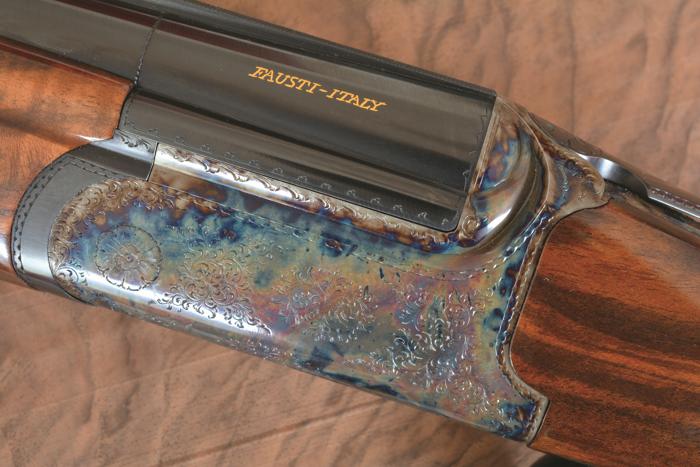 - Finitura: incisione a riccioli di inglesina e festoni sui fianchi e petto di bascula; presenza di cartigli, stemma aziendale Fausti e bandiera italiana, tartarugatura