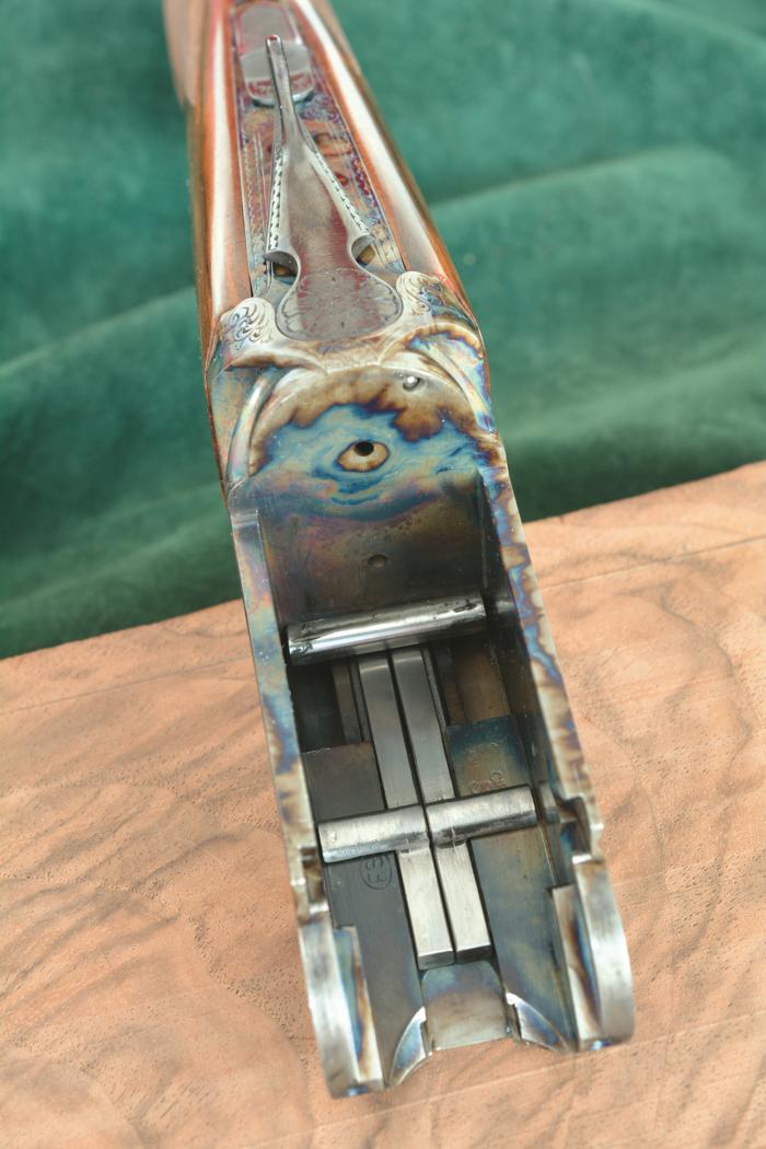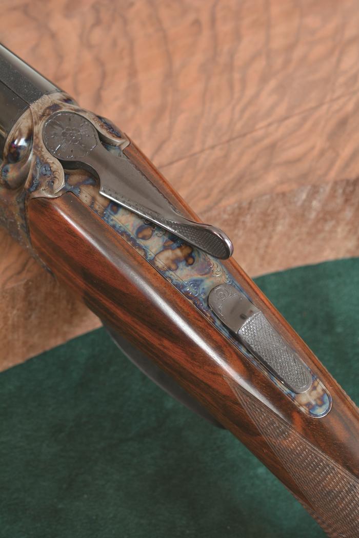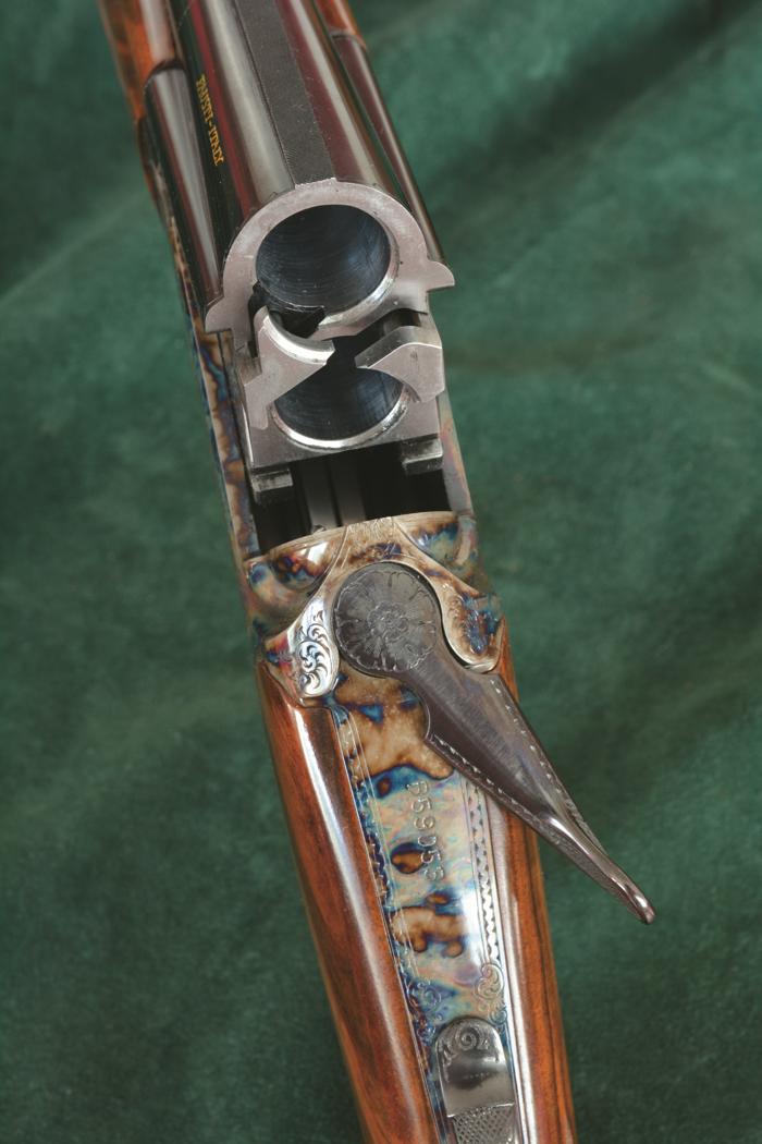 La finitura della bascula in acciaio 18NiCrMo4 a mezze cartelle è l’apprezzata tartarugatura; da sottolineare che trattasi di una vera tartarugatura, come tradizione comanda. Gli inglesi la chiamavano, e la chiamano tuttora, bone & charcoal: il nome deriva dall’antico sistema di tempratura che consisteva nell’inserire piccole porzioni di ossa e corno nella cassetta metallica dove venivano trattati i vari pezzi metallici del fucile. Il tutto adagiato su carboni ardenti. Dopo un determinato periodo di tempo i pezzi metallici del fucile, oramai al calor rosso, venivano estratti dalla cassetta metallica e immersi in acqua distillata o piovana, speso con l’aggiunta di alcuni sali. Ogni artigiano che si rispettava aveva la propria ricetta e sovente nella cassetta venivano inseriti anche alcuni pezzetti di cuoio. Ovviamente non crediamo che la tartarugatura moderna sia ottenuta con gli stessi sistemi di 150 anni fa, ma altrettanto certamente non si tratta di una semplice colorazione chimica, facilmente rovinabile con l’uso intenso, il sudore e l’acidità delle mani. L’effetto finale è veramente grazioso; le nuance di colore sono molteplici e mutano di intensità a seconda della luce incidente. Fausti ha deciso di trattare soltanto la bascula e non anche la minuteria; siamo d’accordo con questa scelta, che privilegia la sobrietà, pur mantenendo tutta l’eleganza della finitura. La lunga disquisizione sulla tartarugatura non deve far dimenticare che esiste un altro livello di finitura stato applicato sul fucile: il tappeto di inglesina piuttosto fine si estende per buona parte dei fianchi e del petto di bascula, una serie di bordini contorna i particolari metallici. Naturalmente l’occhio percepisce con un attimo di ritardo questa incisione, peraltro eseguita manualmente e firmata dal maestro incisore nei pressi del ponticello, proprio per la presenza della tartarugatura. In ogni caso l’effetto è di grande bellezza. Il petto di bascula presenta il nome aziendale inserito in un cartiglio e il nome identificativo del modello scritti in oro e stampatello subito sotto la stilizzazione della bandiera italiana. La testa di bascula presenta un accurato lavoro manuale di lima e scalpello che ha determinato una forma delle conchiglie armoniosa ed elegante. Sulla canna superiore, a sinistra, compare la scritta “Fausti – Italy”, sempre in oro. La calciatura è realizzata in legno di noce circasso o turco altamente selezionato (grado 4 secondo classificazione aziendale) e finito a olio, con numerose e variegate venature su tutta la superficie lignea. Sul calcio è presente lo scudetto sul calcio, per la scrittura a bulino delle iniziali del proprietario, in argento o in oro. L’impugnatura, personalizzabile, è un marchio di fabbrica della recente produzione Fausti, vale a dire un Woodward a mezza pistola con coccia in metallo; questa soluzione consente all’utilizzatore una presa salda praticamente quanto l’impugnatura a pistola, ma risulta decisamente più elegante, snellendo l’insieme del fucile. Il massimo delle forme snelle lo si raggiunge con l’impugnatura all’inglese, ma anche la Woodward fa la sua bella figura grazie al tocco decorativo della coccia metallica trattenuta in situ da una vite a taglio in posizione centrale, incisa e contornata da una rosetta. Ottima la scelta di Fausti di zigrinare direttamente il legno della calciatura, senza l’adozione di un calciolo vero e proprio; è visibile una sola vite a taglio e incisa, posta in posizione decentrata, nel terzo inferiore del calciolo. C’è ovviamente una zigrinatura per permettere un appoggio non scivoloso sulla spalla del cacciatore durante l’imbracciata. Soluzione elegante e appropriata alla classe dell’arma. Lo zigrino sull’impugnatura è del tipo a passo fine, da 1 millimetri, eseguito manualmente ma con disegno non particolarmente innovativo. L’astina è all’inglese, dalle forme filanti, degno completamento della calciatura; il suo sgancio è affidato a un comando ad auget ben realizzato, lungo, inciso e brunito. La chiave di apertura si discosta un poco dal resto: presenta soltanto una leggera incisione sulla testa e un sottile bordino, con la palmetta zigrinata per l’appoggio del pollice. Design equilibrato, grazie anche alla codetta di bascula che ospita soltanto il sottile cursore zigrinato della sicura. Il ponticello ospita un classicissimo bigrillo. Un minimo di abitudine e la velocità di sparo delle due fucilate sarà indistinguibile da un monogrilletto. Di elevato livello l’incassatura, grazie al preciso accoppiamento fra metallo e porzione lignea.